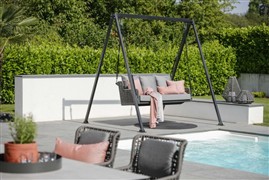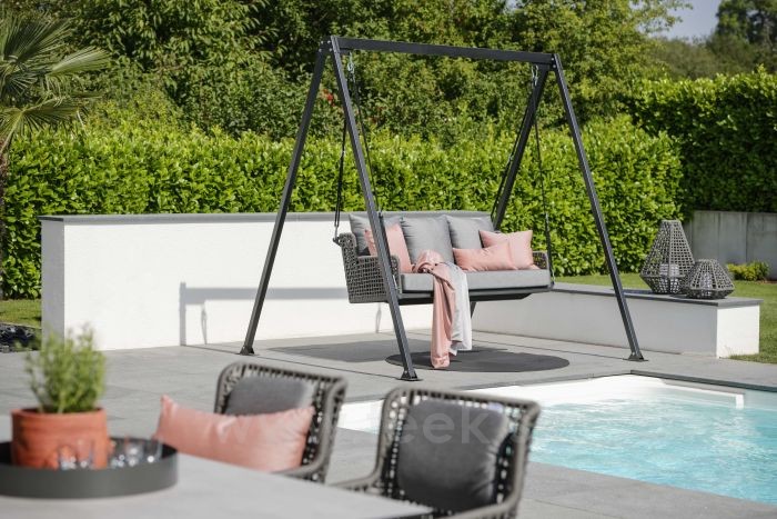 Relaxačný nábytok vrátane dennej vonkajšej postele z lankového výpletu.