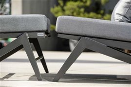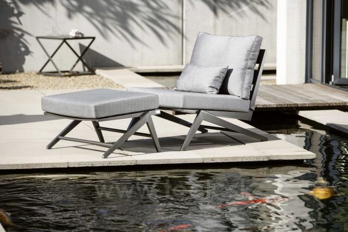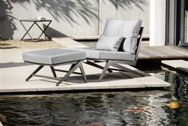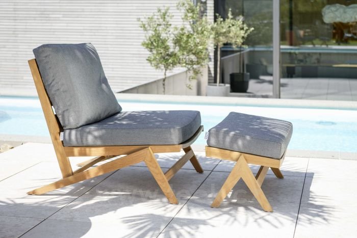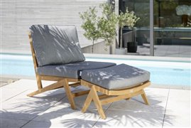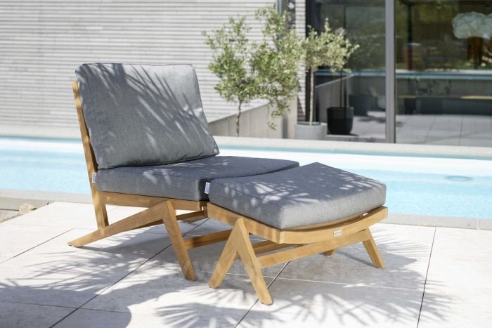 Relaxačné kreslá a podnožky z teakového dreva a hliníka.