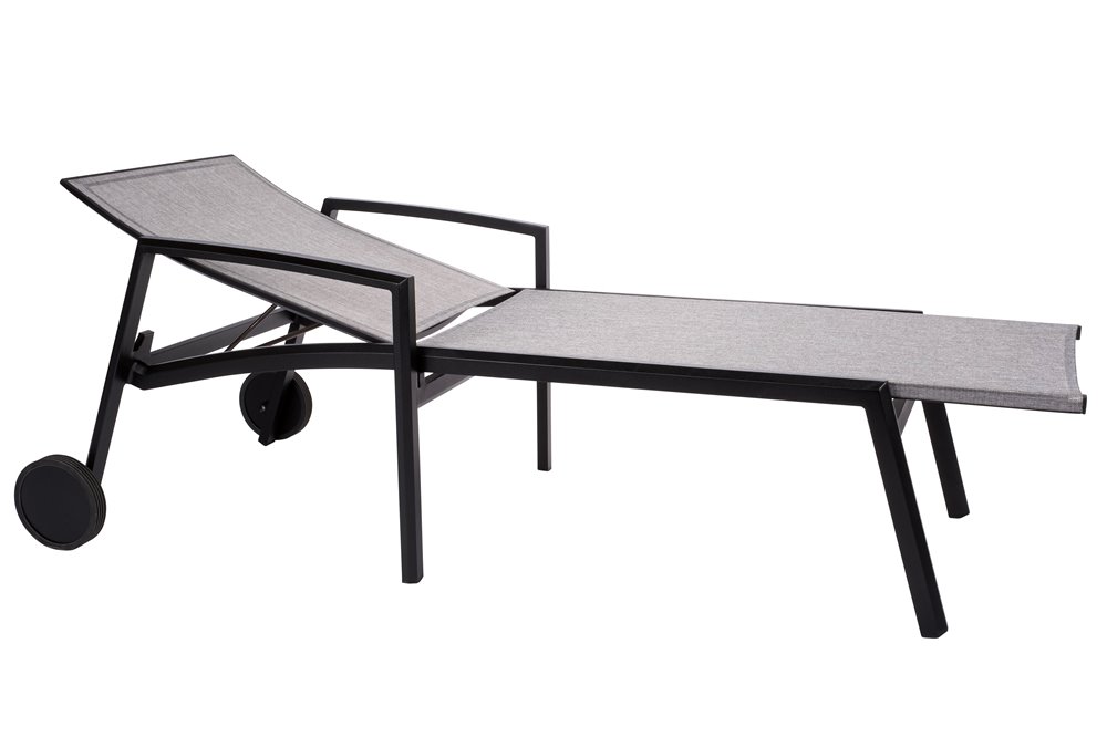 Polohovateľné kreslá s podrúčkami a kolieskami s lakovaným hliníkovým rámom a textilným výpletom.