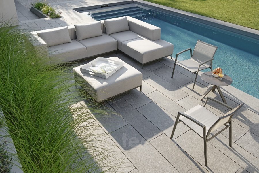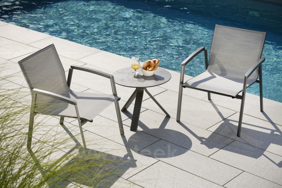 Nízké hliníkové relaxační křeslo v několika barevných provedeních. Má lakovanou hliníkovou konstrukci, výplet z pohodlného a pružného textilenu.