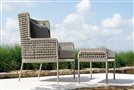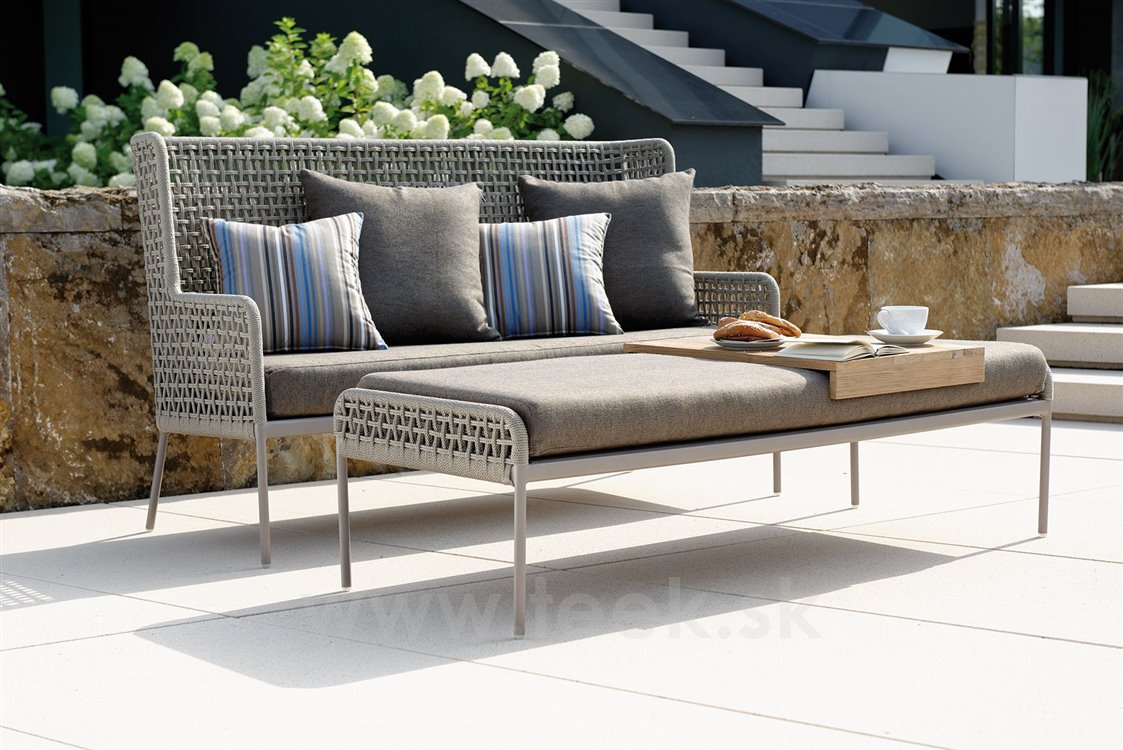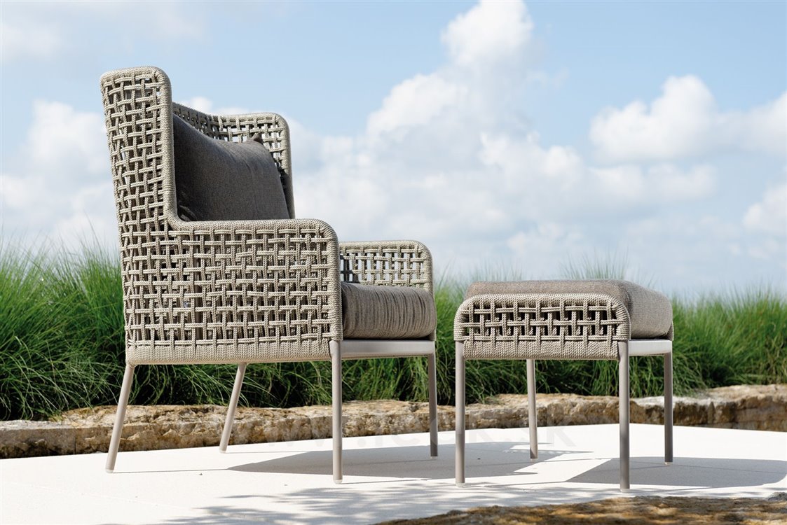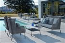 Greta Lounge je široká kolekcia, ktorá zahŕňa konferenčný stolík, záhradnú pohovku, nízke kreslo a podnožky. Rám je vyrobený z hliníka s práškovou povrchovou úpravou, prútie je vypletené káblom, sedáky a opierky sú vyrobené z vonkajších látok (vyplnené bežnou penou).