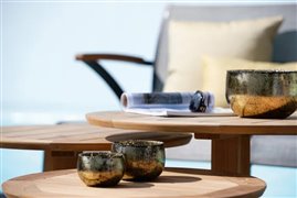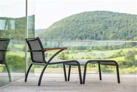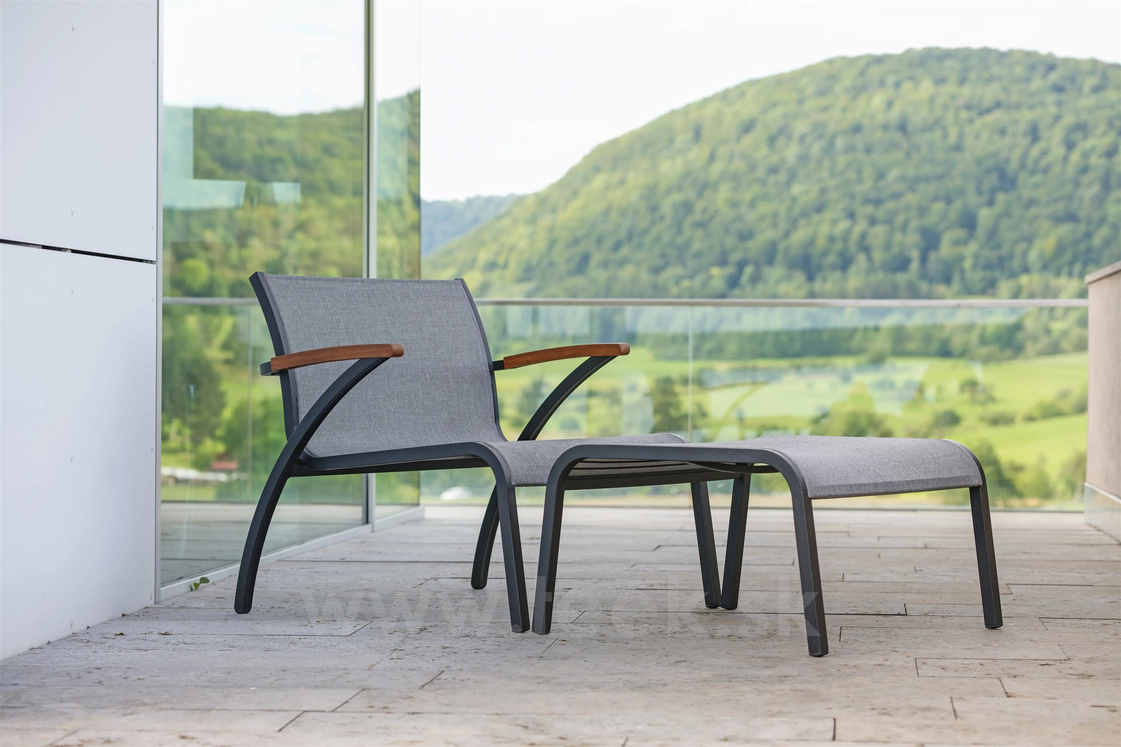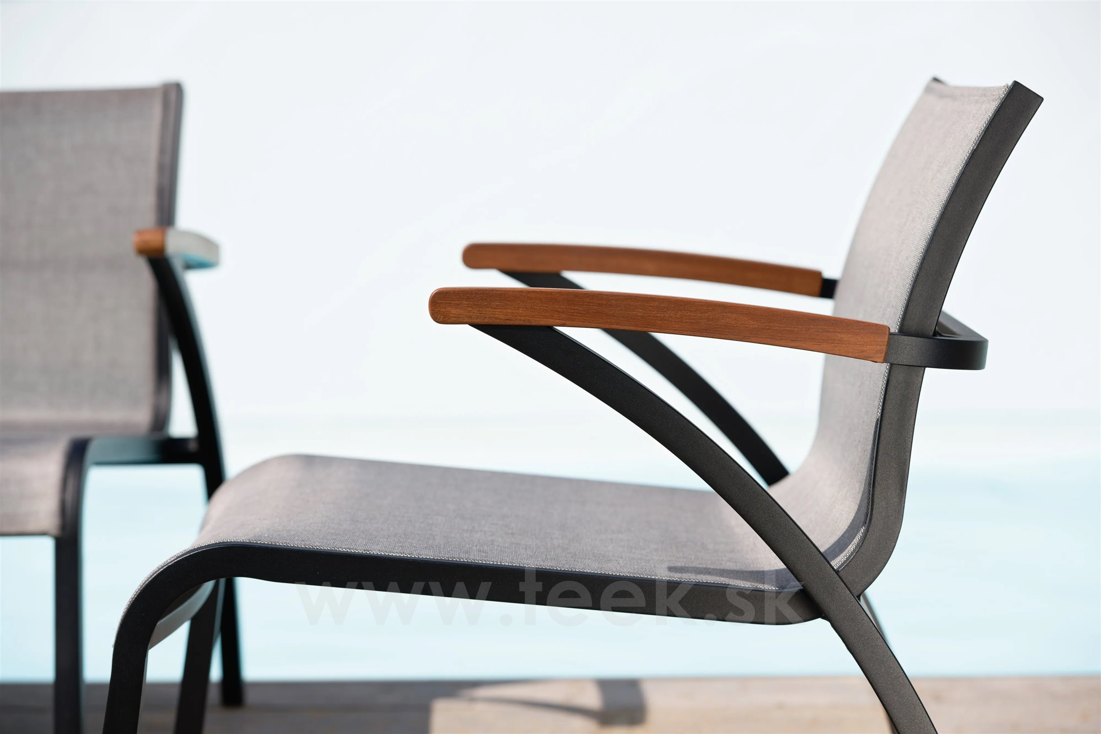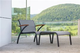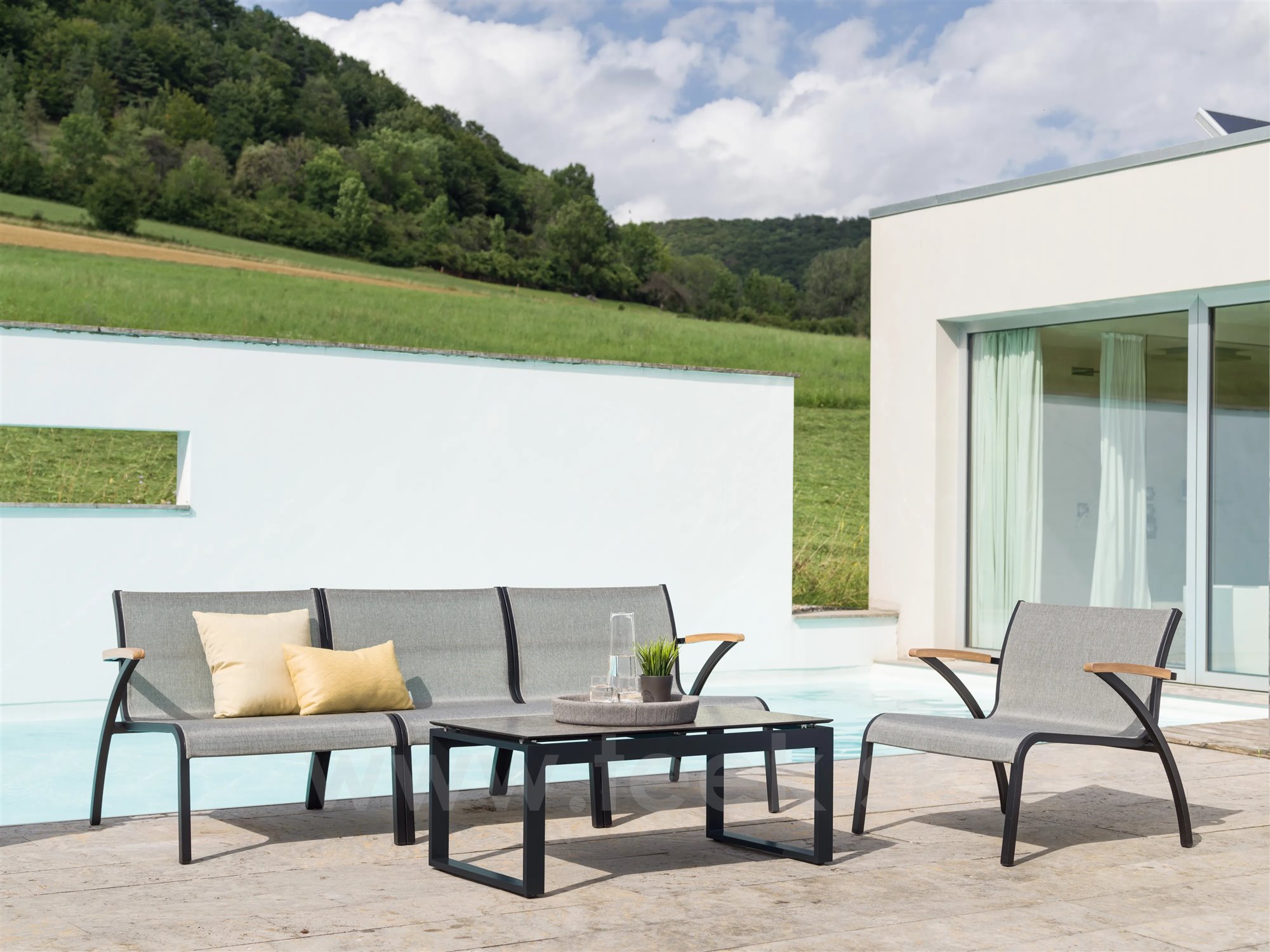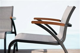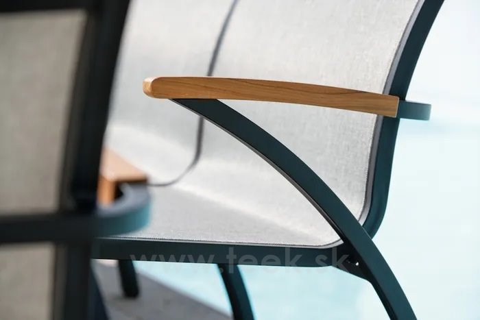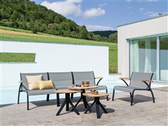 Modulárna sedacia súprava z lakovaného hliníka, teakového dreva a textílií.