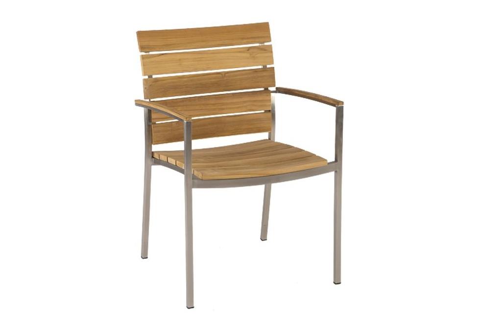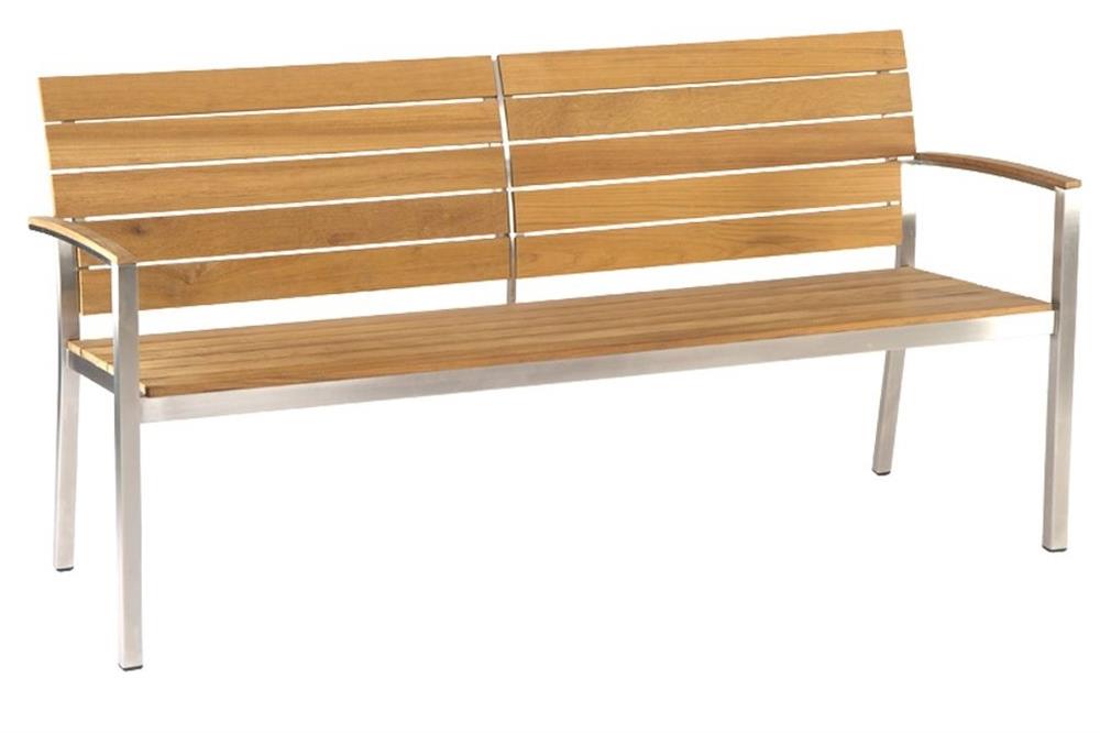 Kolekcia záhradných lavičiek a jedálenských stoličiek Savona by Stern. Záhradný nábytok má rám z nehrdzavejúcej ocele, sedadlo a operadlo sú vyrobené z teakových lamiel.