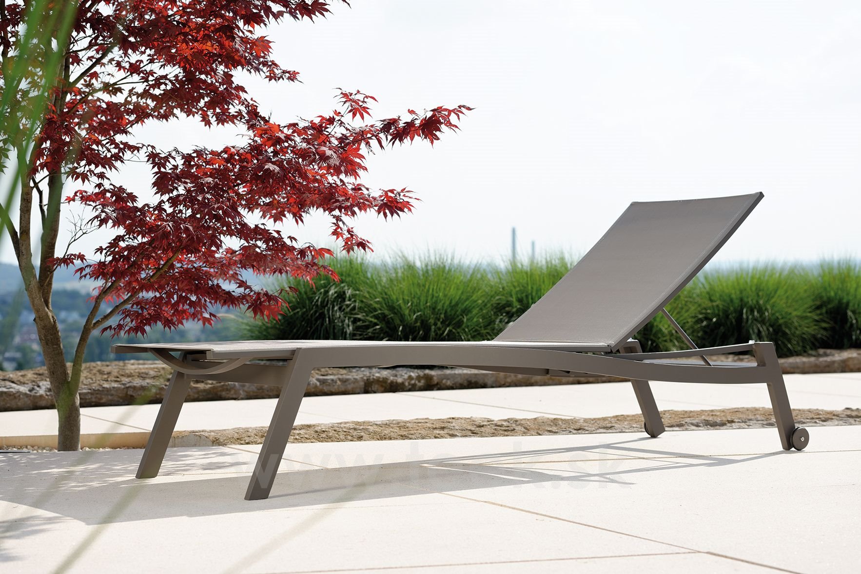 Polohovateľné vonkajšie hliníkové lehátka v rôznych farbách s pružným textilným výpletom a kolieskami.