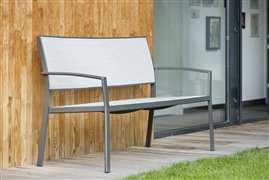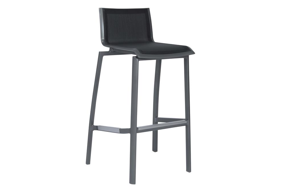 Vonkajšie hliníkové barové stoličky a jedálenské lavice v rôznych farbách s pružným textilným výpletom. Jedálenský nábytok možno kombinovať so všetkými hliníkovými kolekciami Stern.