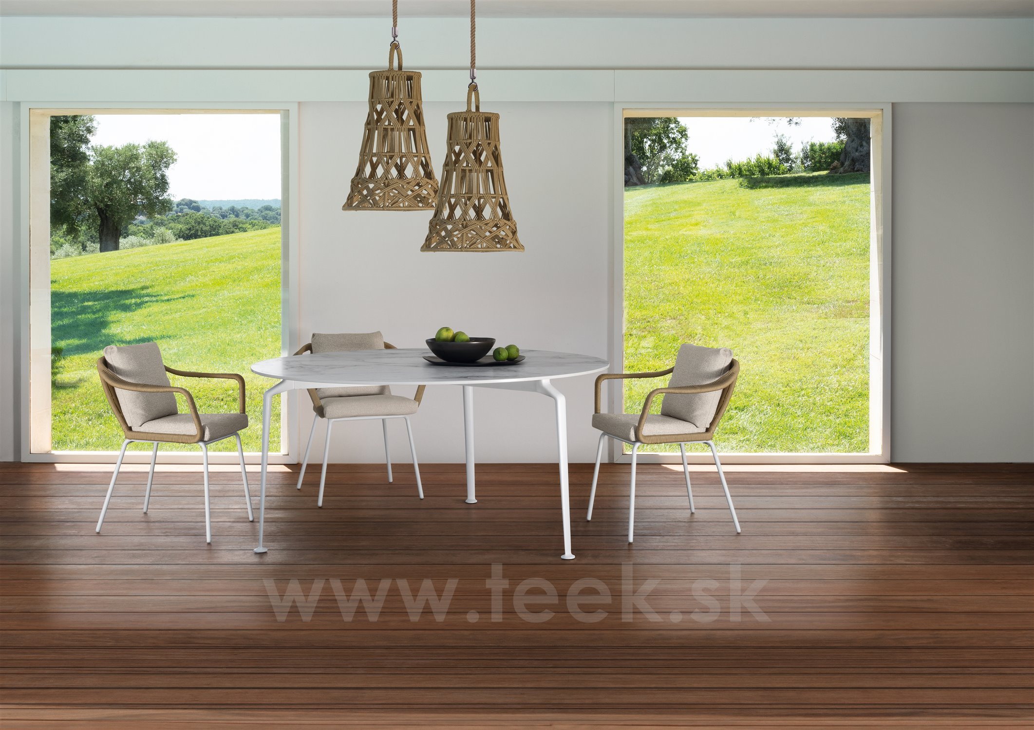 Dizajnové jedálenské stoly a kreslá.
