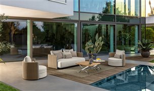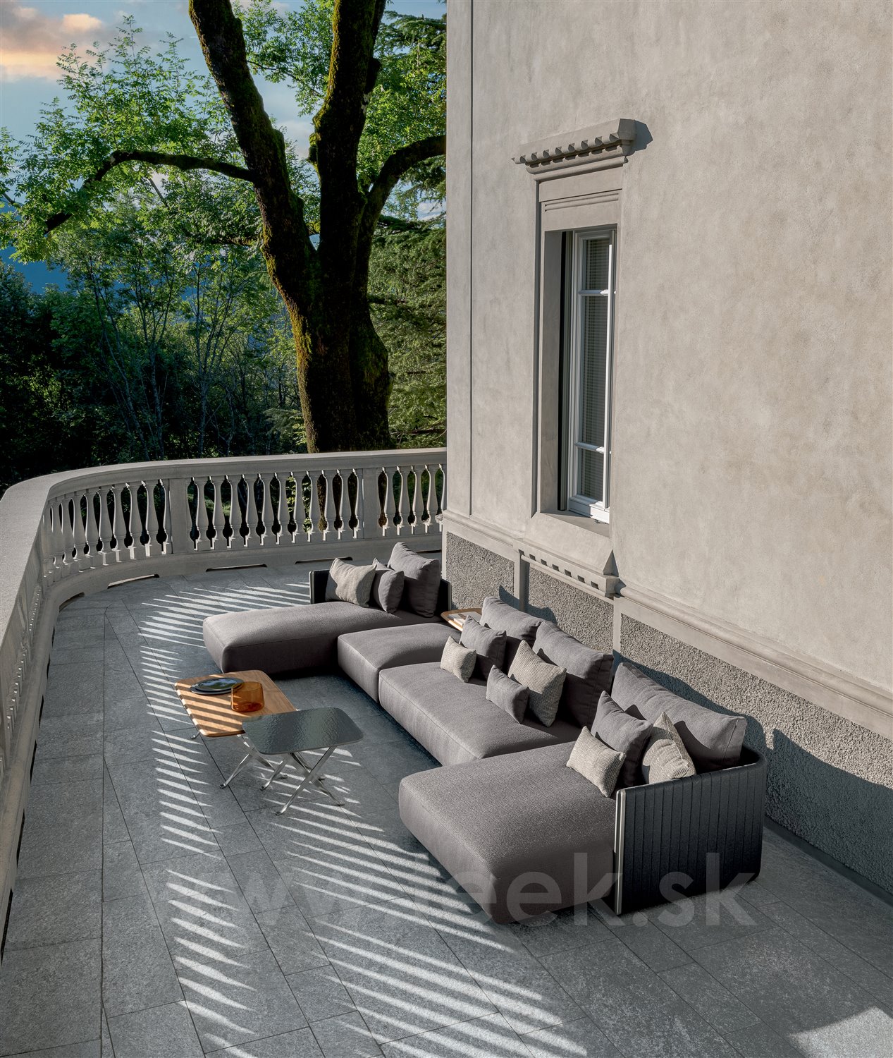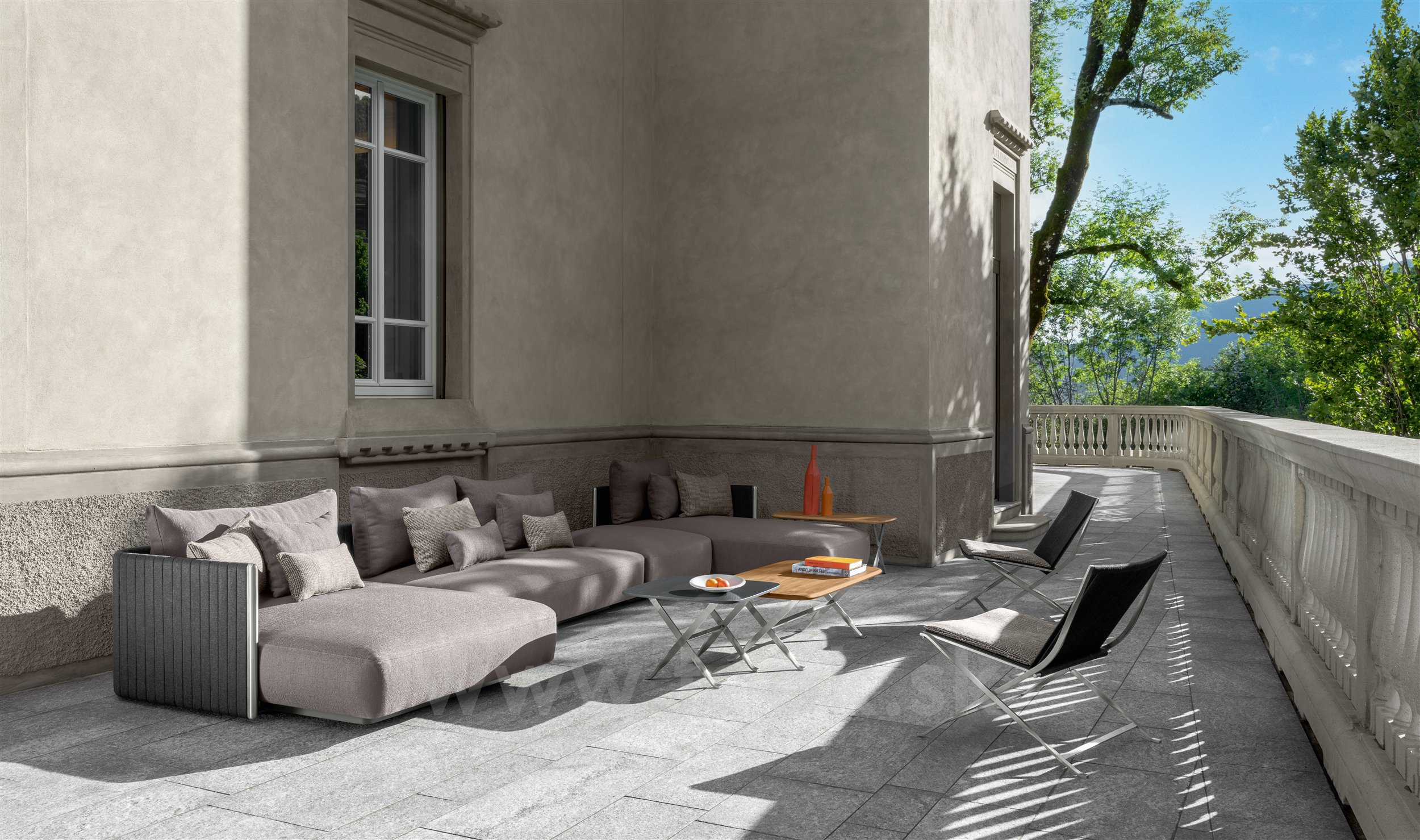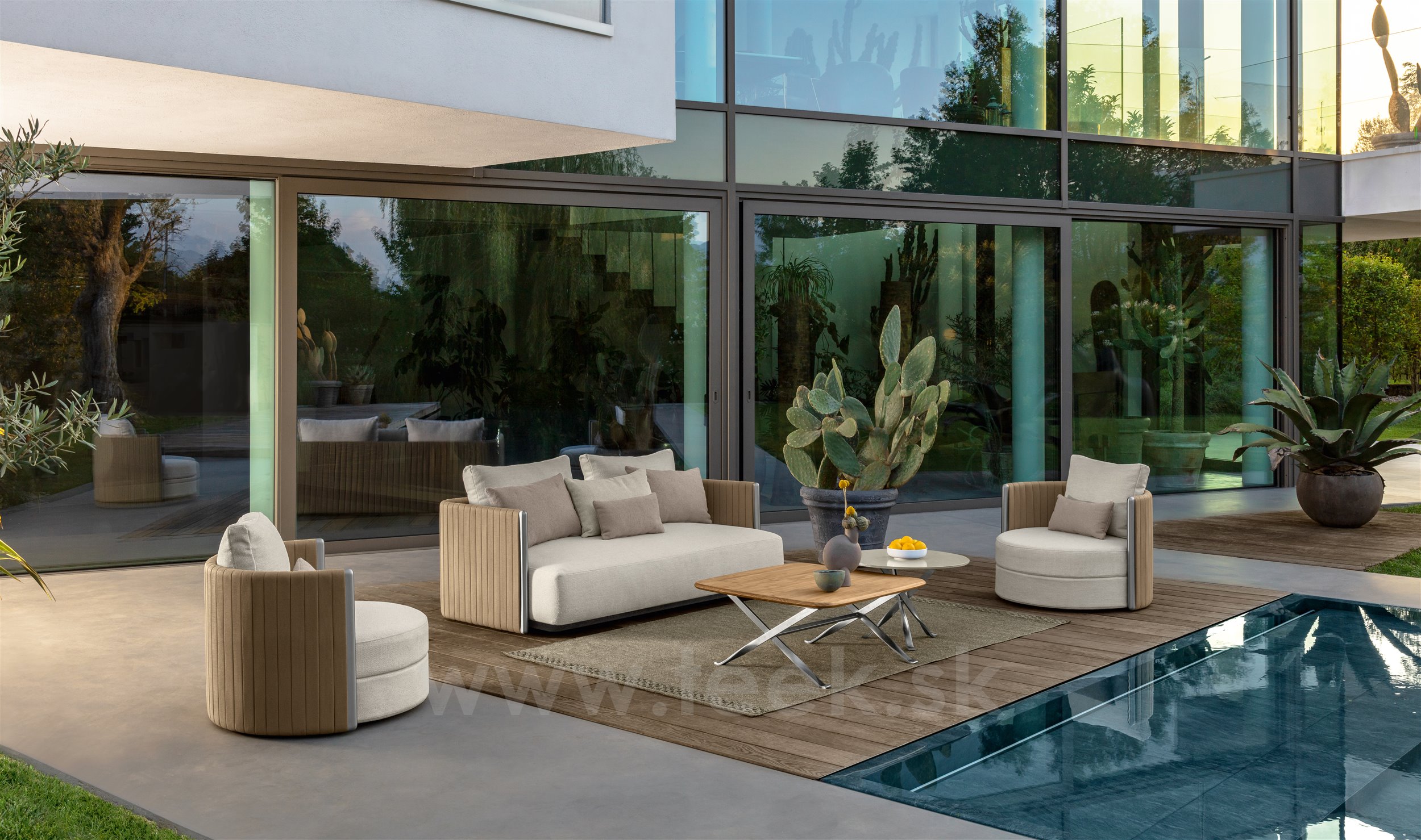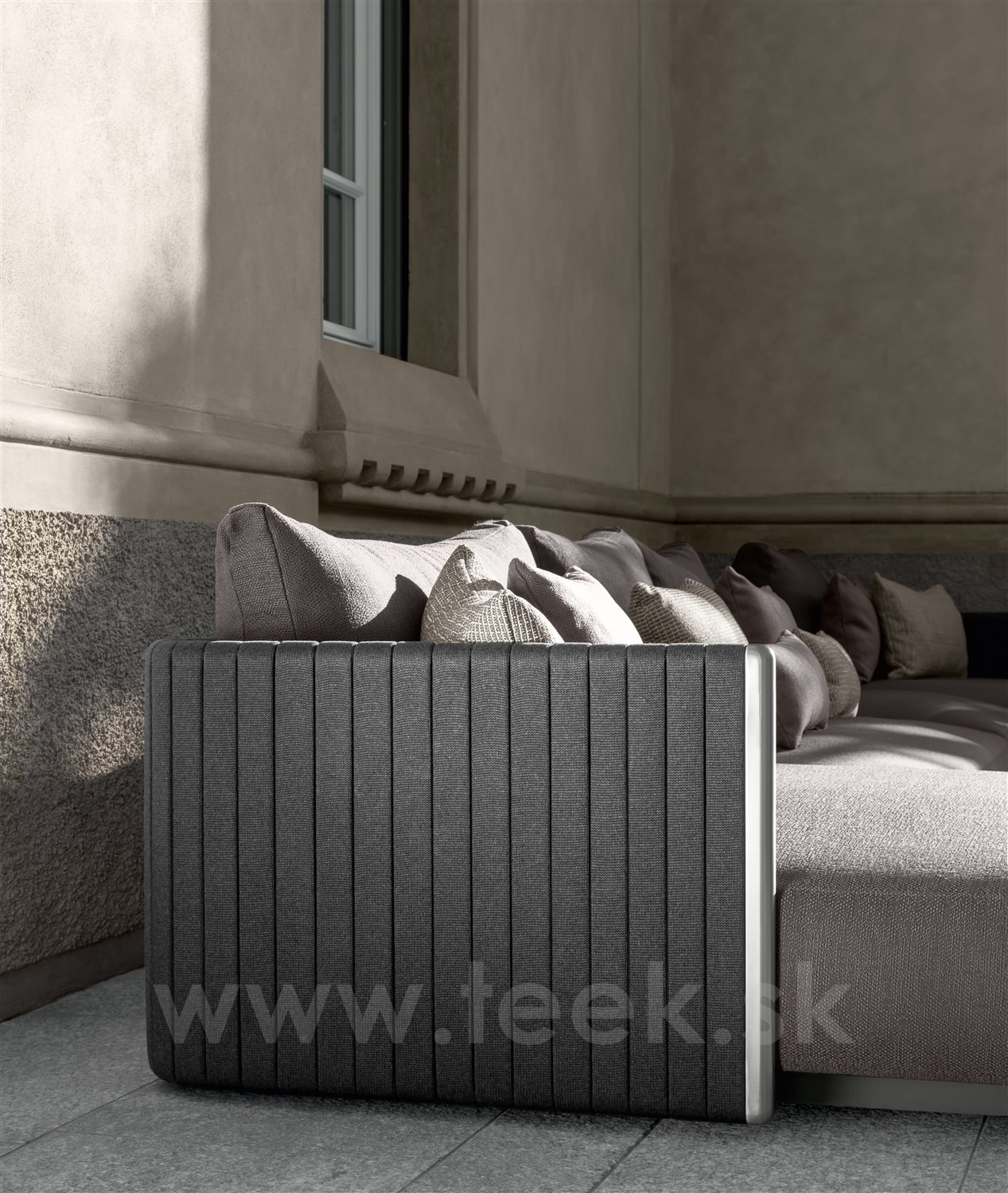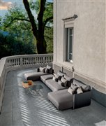 Dizajnová modulárna vonkajšia sedacia zostava.