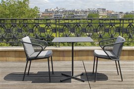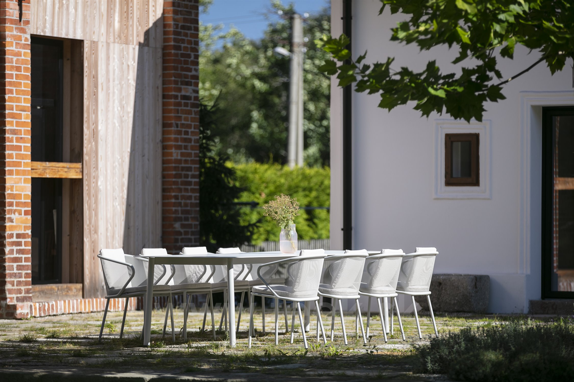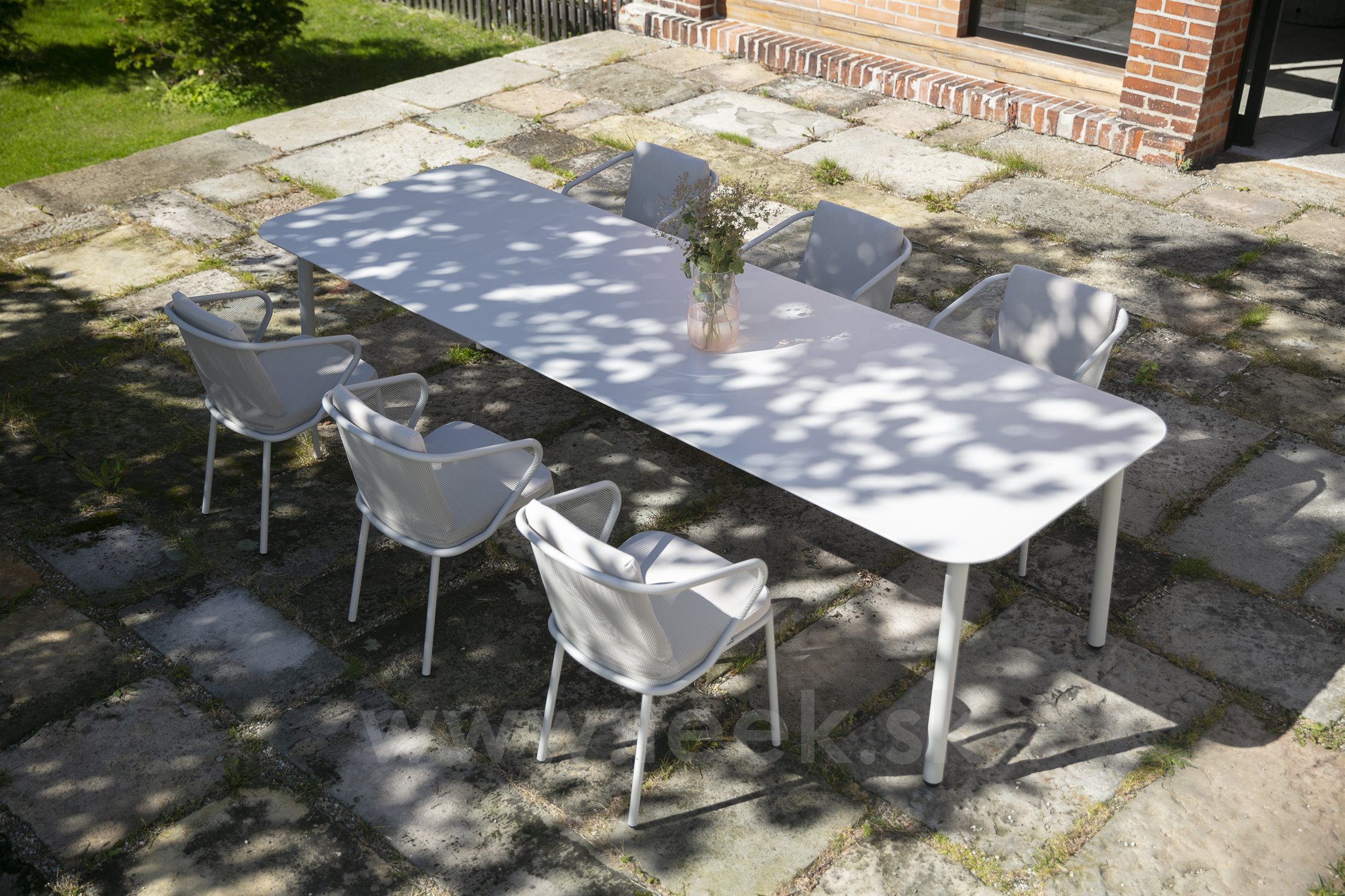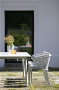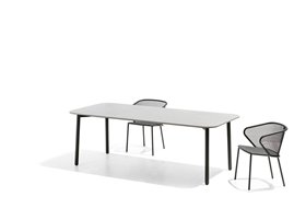 Garden furniture Condor by Todus. Construction in painted stainless steel, HPL table tops or ceramic. The collection includes a dining chair and garden tables in various sizes.