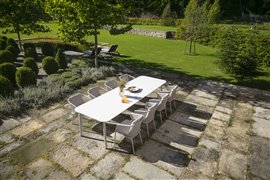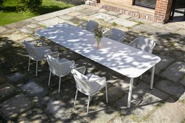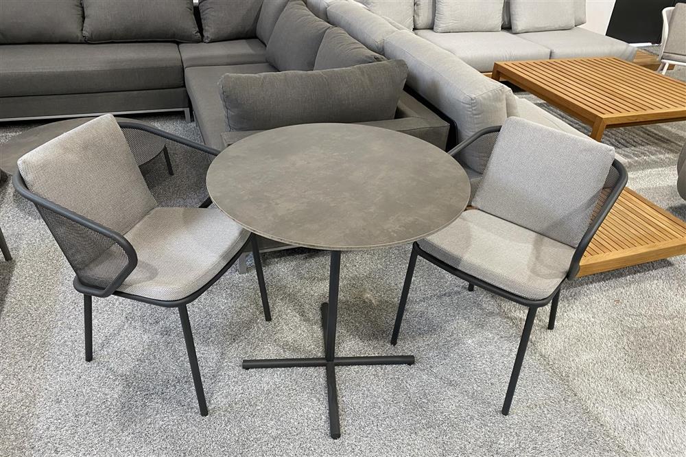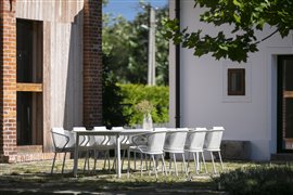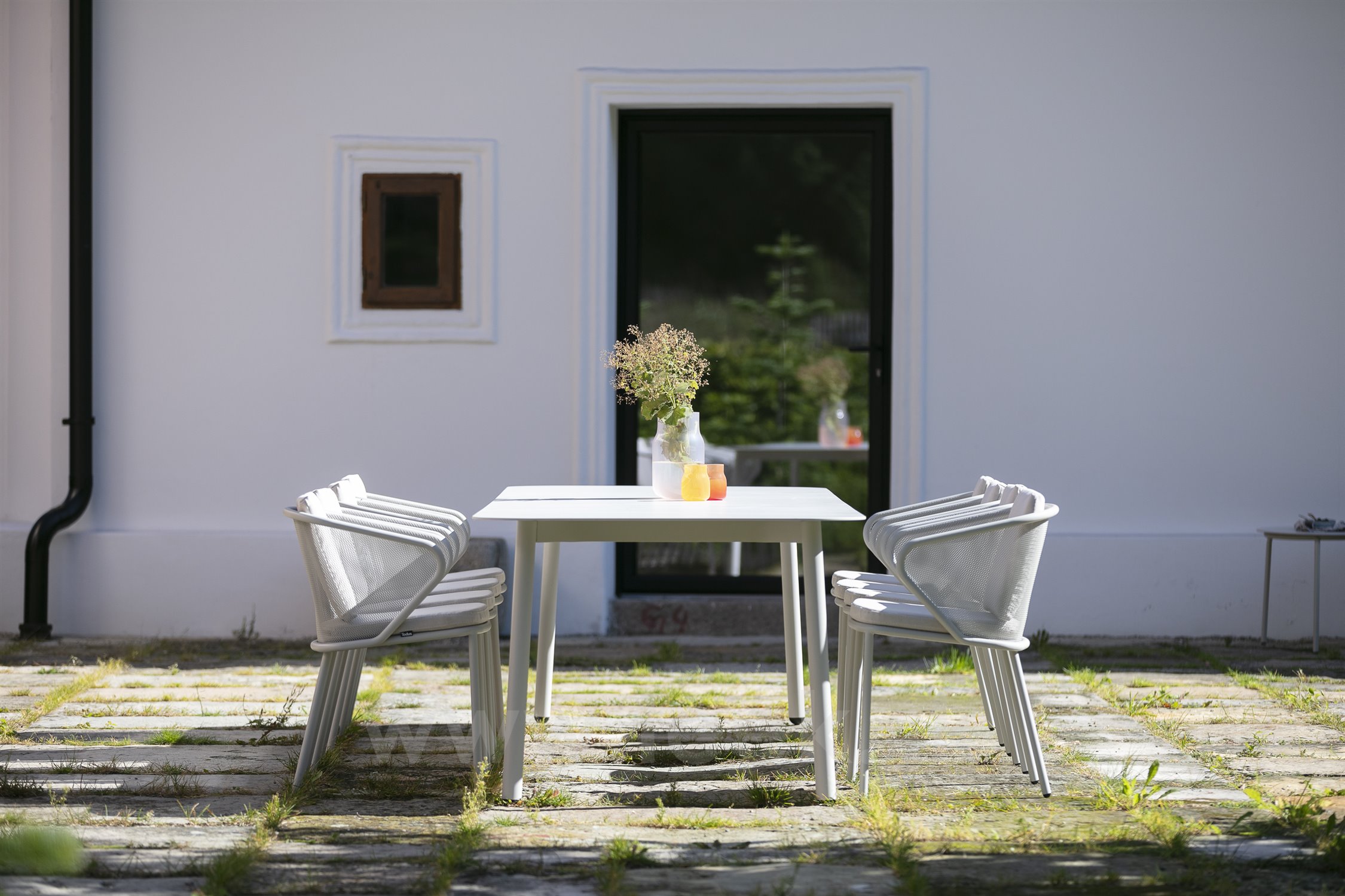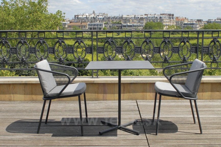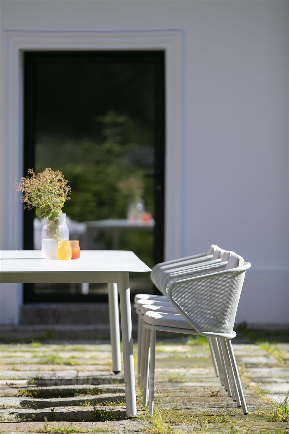 Garden furniture Condor by Todus. Construction in painted stainless steel, HPL table tops or ceramic. The collection includes a dining chair and garden tables in various sizes.