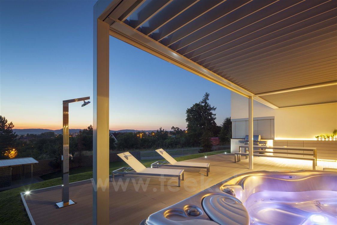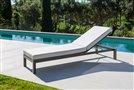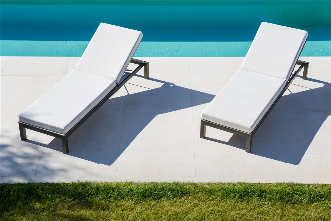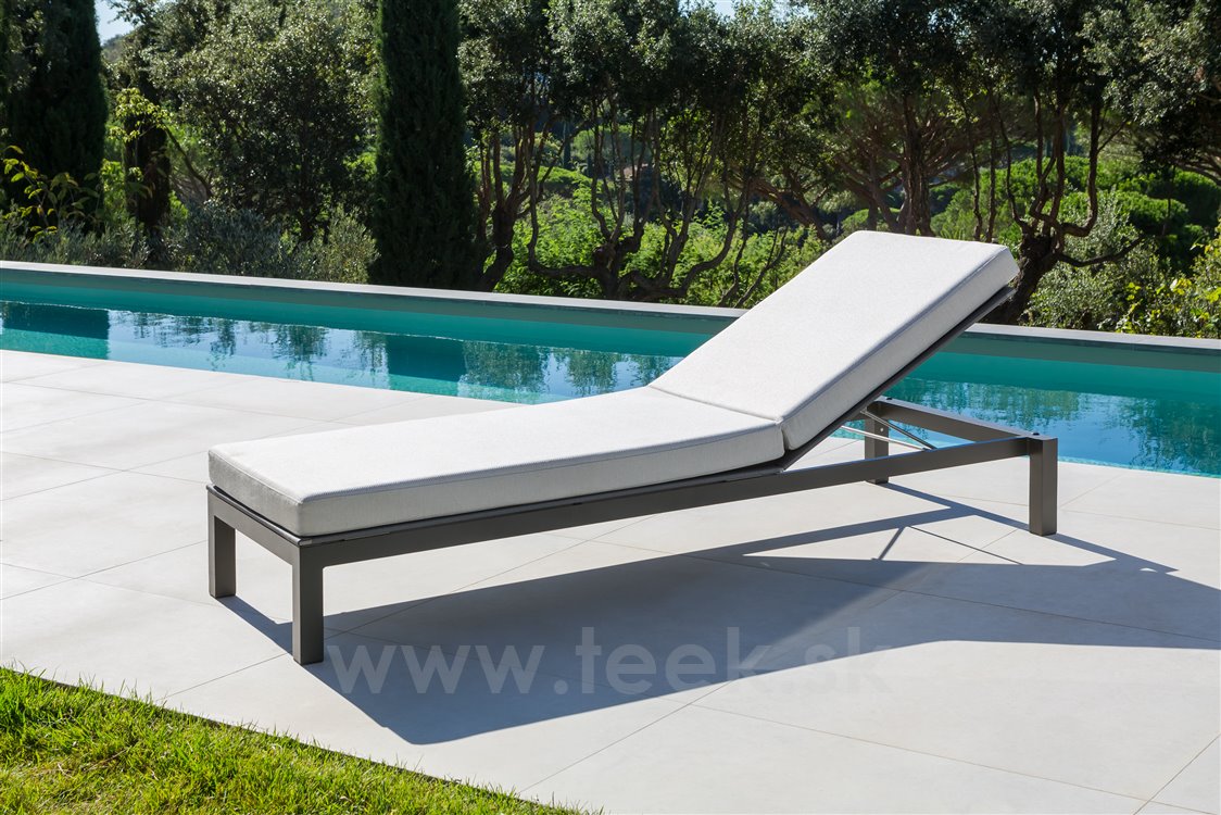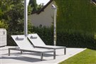 Leuven garden furniture by Todus. The construction of the garden furniture is made of painted aluminium or, in some models, brushed stainless steel. The chaise lounges are made of branded textile (Batyline). The collection includes garden chaise lounges and a storage table.