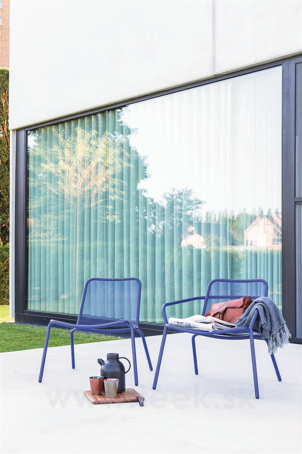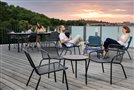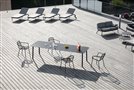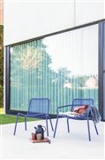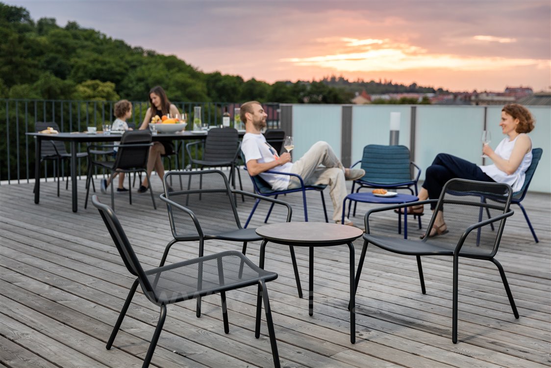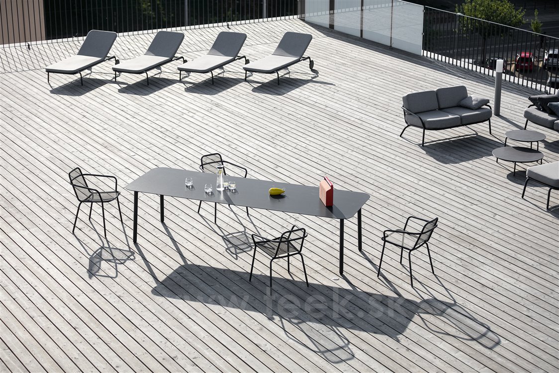 Starling garden furniture by Todus. The frame is made of painted stainless steel. The collection includes a low garden chair and armchair, deck chairs, storage and coffee tables.