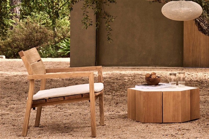 Teakové nízke kreslá a stolíky inšpirované japonskou kultúrou.