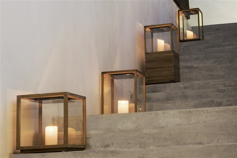 Štýlové vonkajšie svietniky Tribu z teakového dreva.