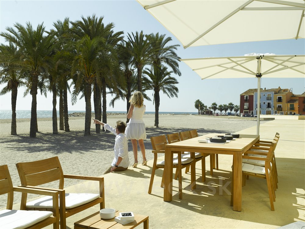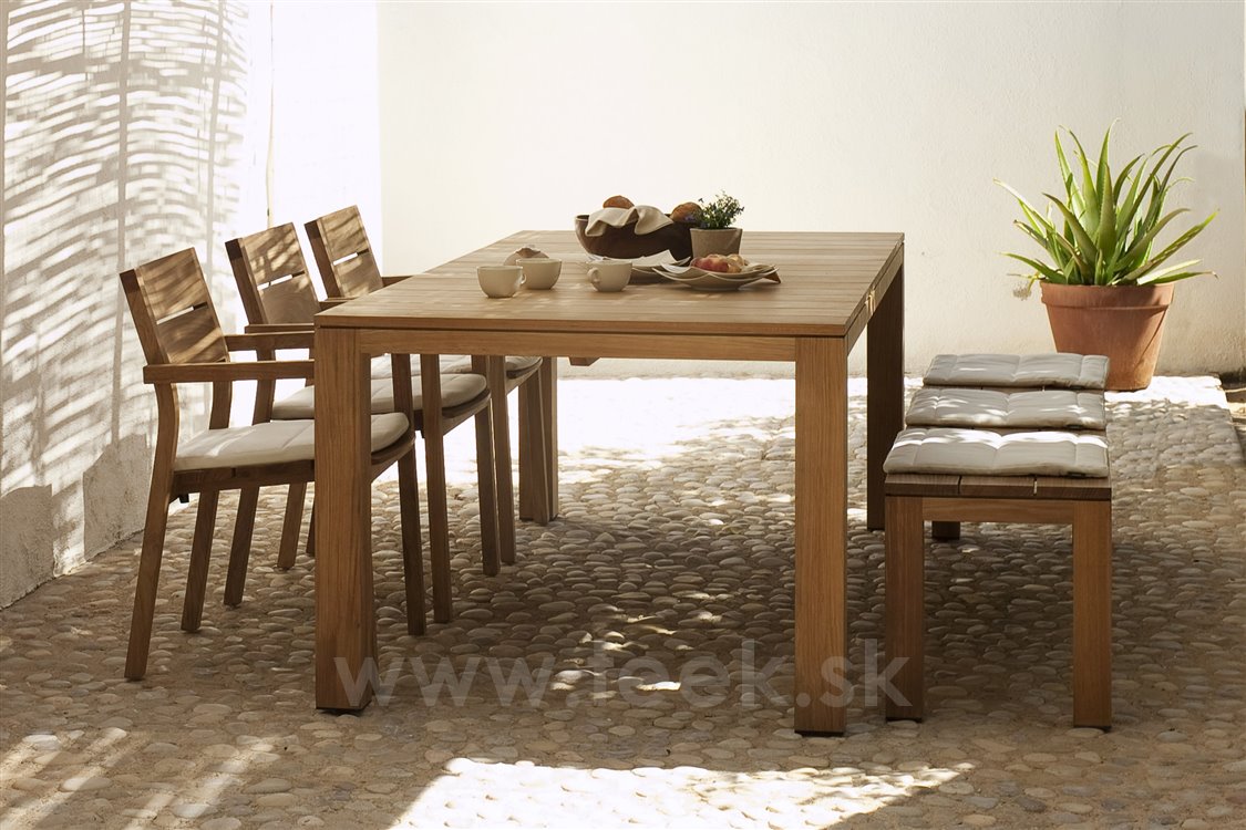Kolekcia vonkajšieho jedálenského nábytku Kos Teak od spoločnosti Tribu. Všetok nábytok z tejto kolekcie má pevnú konštrukciu z teakového dreva.