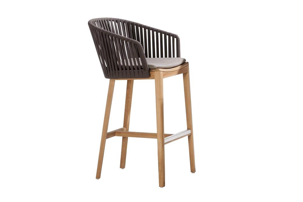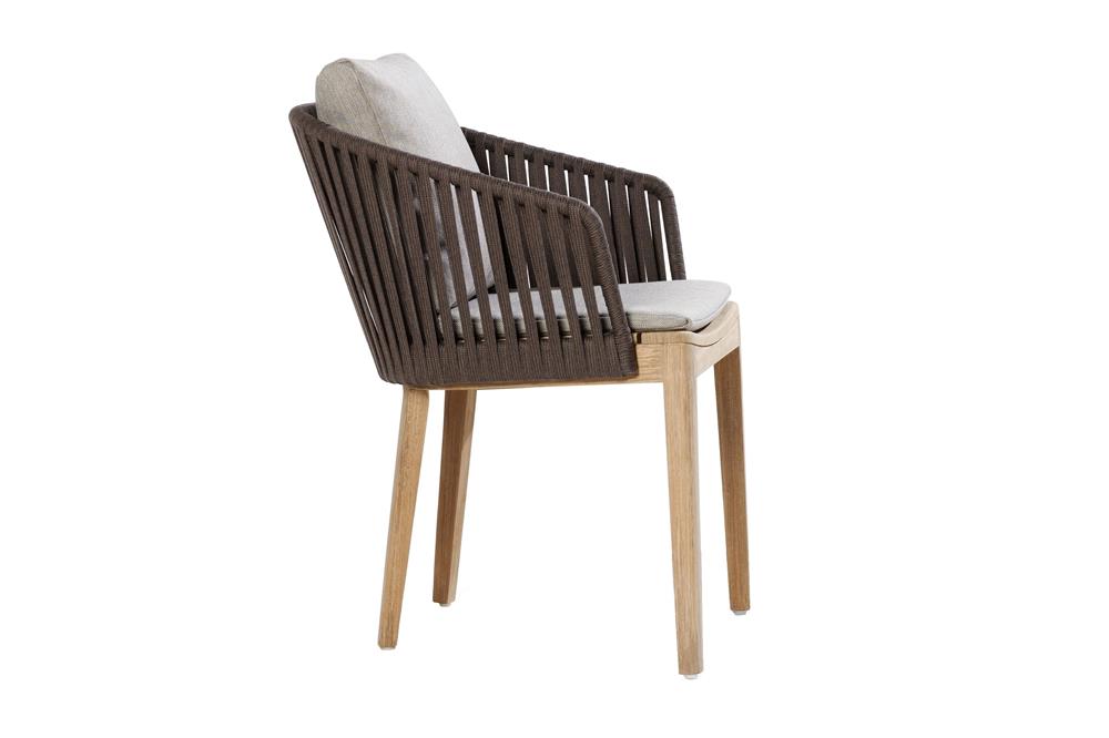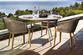 Kolekcia vonkajšieho jedálenského nábytku Mood od spoločnosti Tribu. Konštrukcia nábytku je vyrobená z teakového dreva v kombinácii s káblovým výpletom.