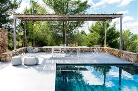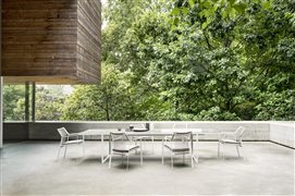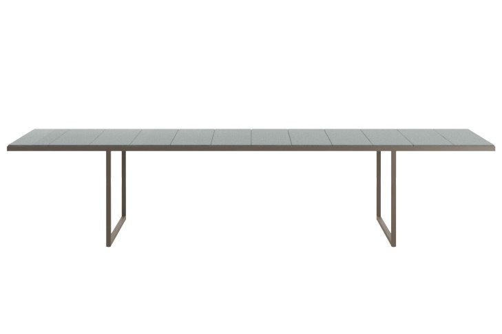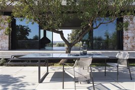 Vonkajší jedálenský stôl Nox od spoločnosti Tribu s glazovanou doskou z lávového kameňa.