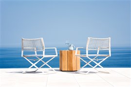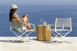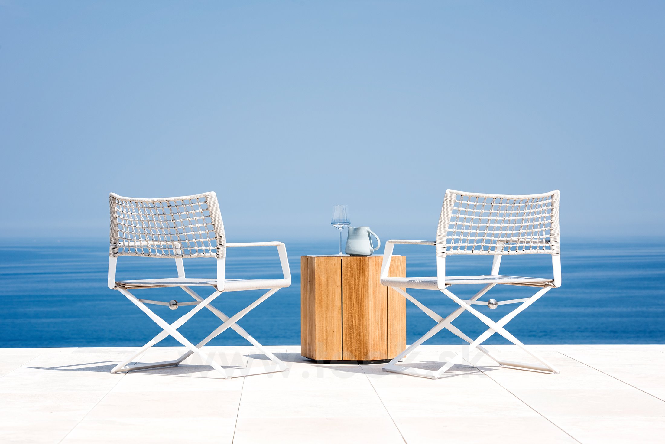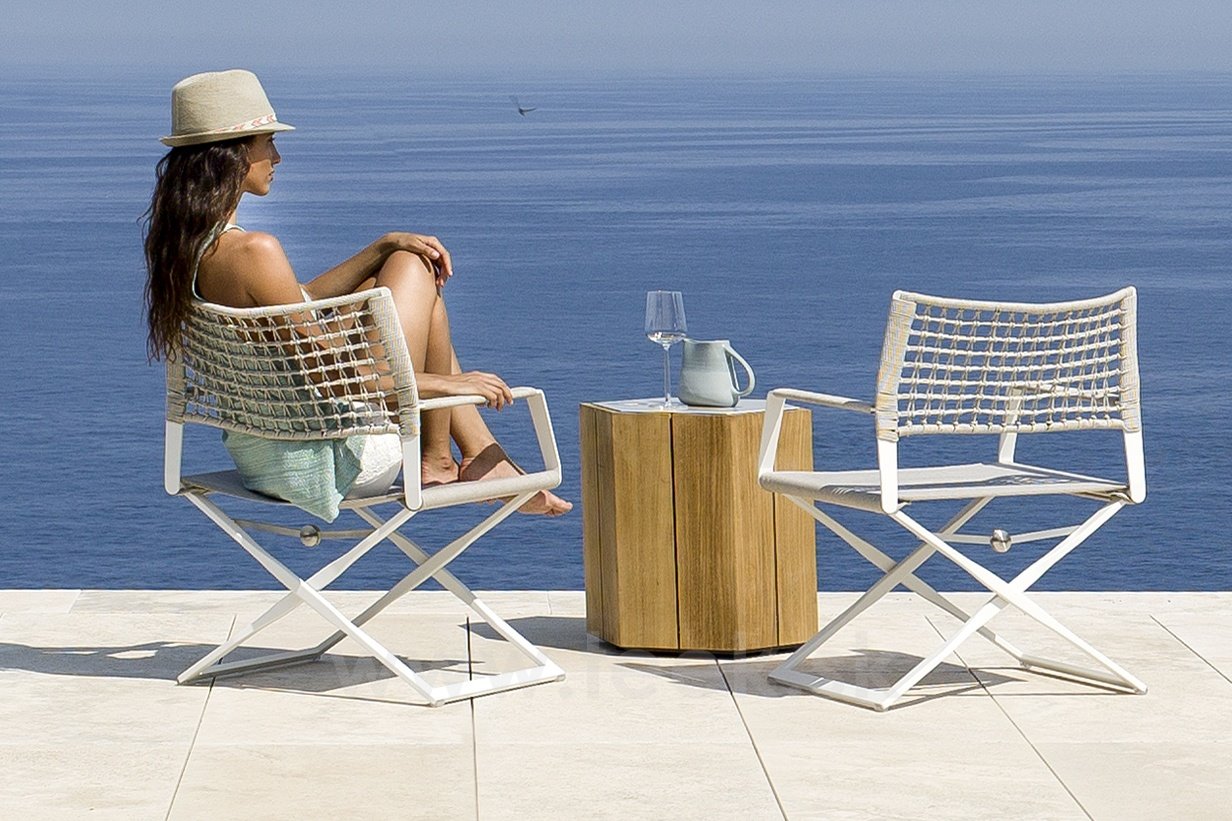 Relaxačné vonkajšie skladacie kreslo Regista od spoločnosti Tribu. Opierka chrbta je z káblového výpletu, sedadlo je kvalitné vonkajšie.