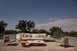 Vonkajšia modulová sedacia súprava Senja značky Tribu so sedákmi vo vonkajšej kvalite.