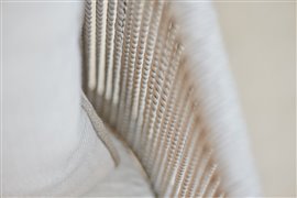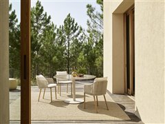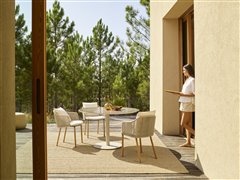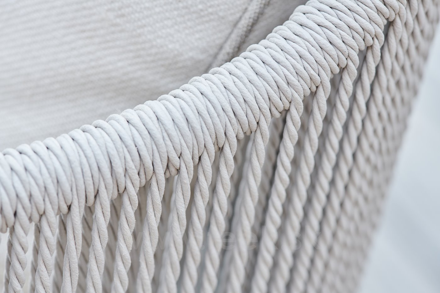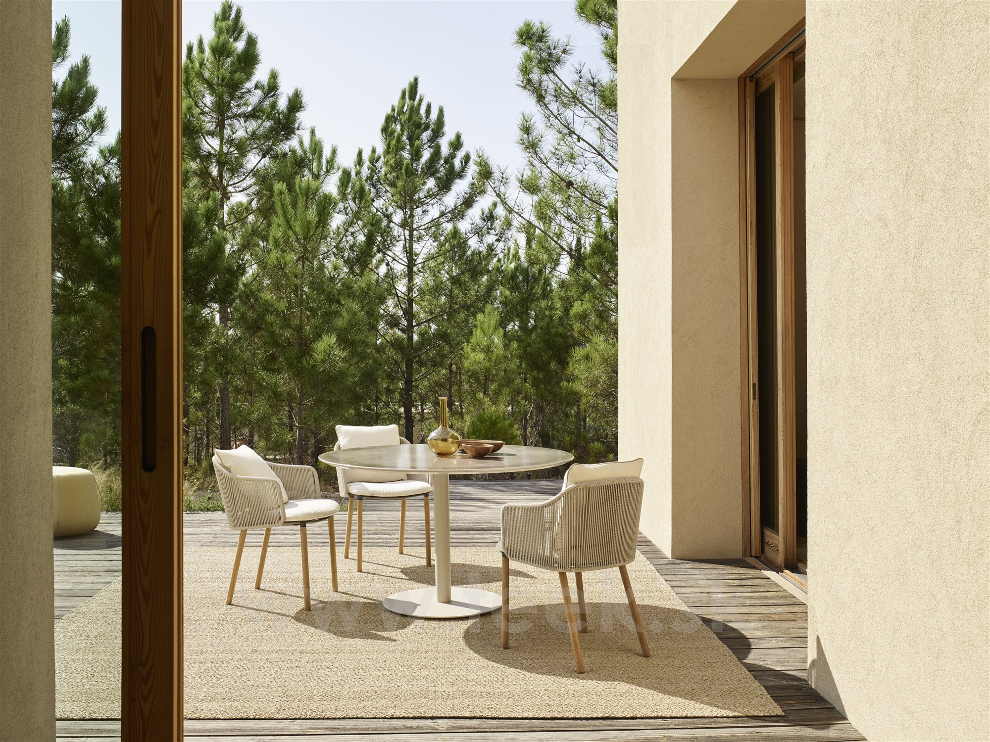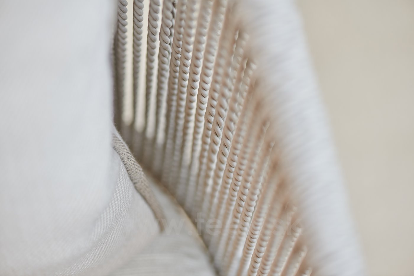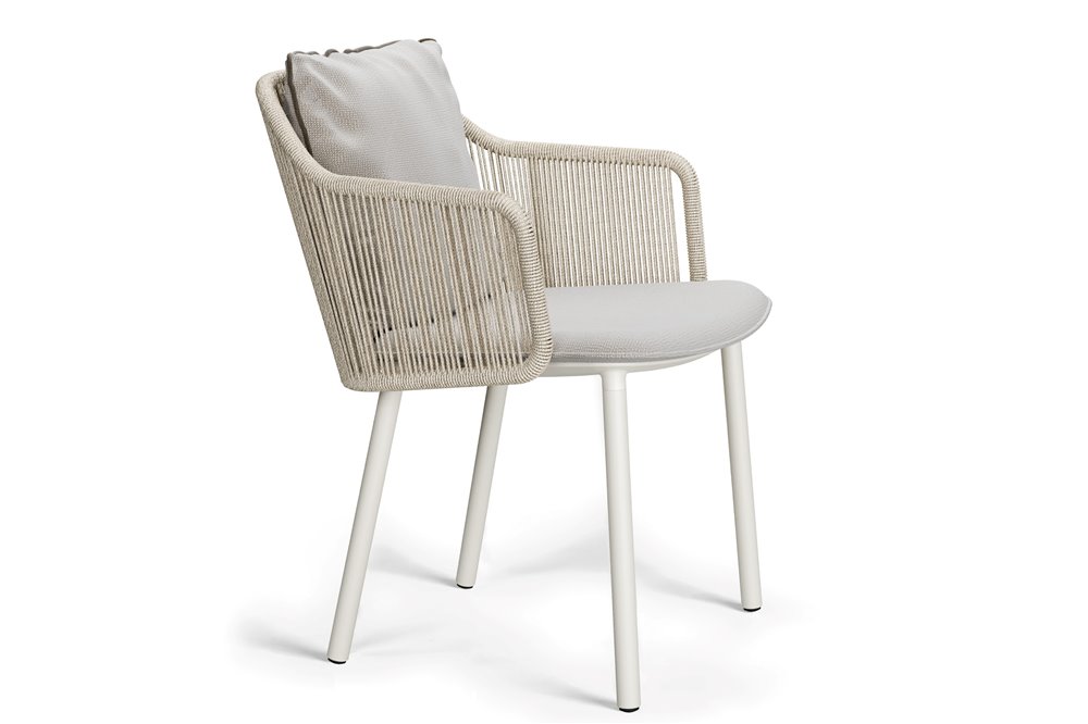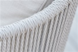 Vonkajšie jedálenské stoličky Senja od spoločnosti Tribu s káblovým výpletom. Sedadlo je vyrobené z vonkajšej tkaniny na celoročné použitie.