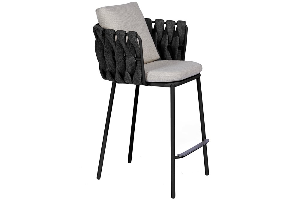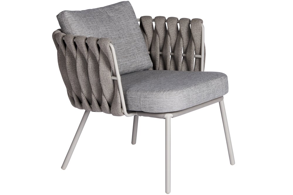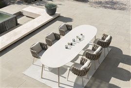 Vonkajší jedálenský nábytok Tosca od spoločnosti Tribu. Vyrobený z plneného pásového výpletu. Vankúše na sedenie odolné voči všetkým poveternostným vplyvom.