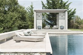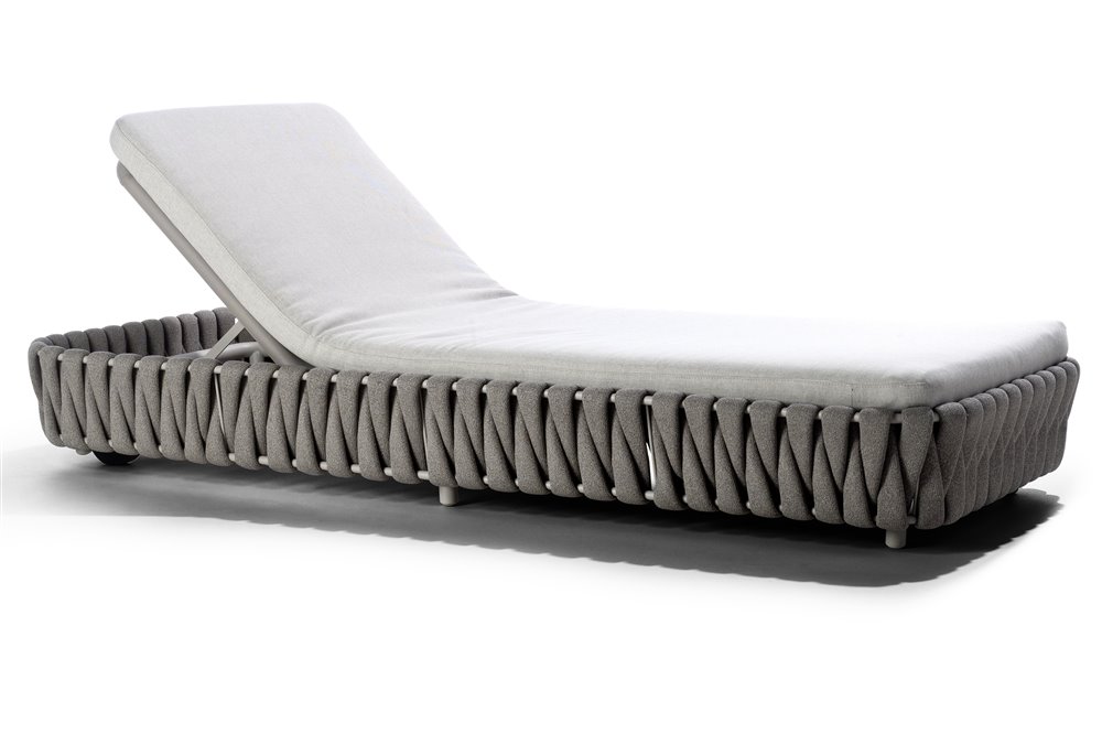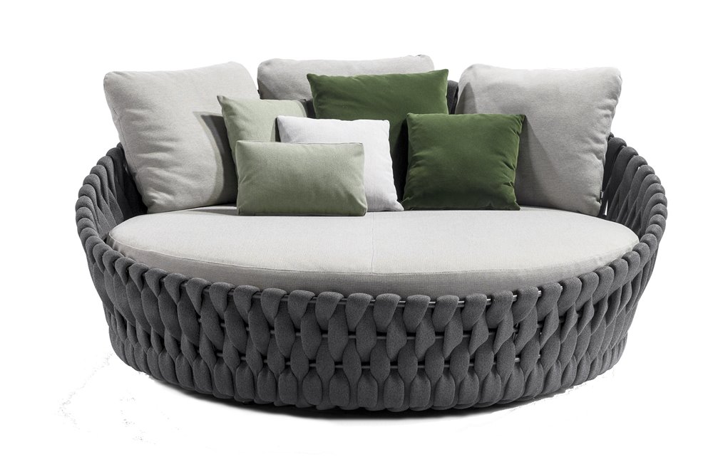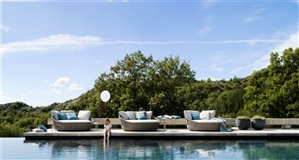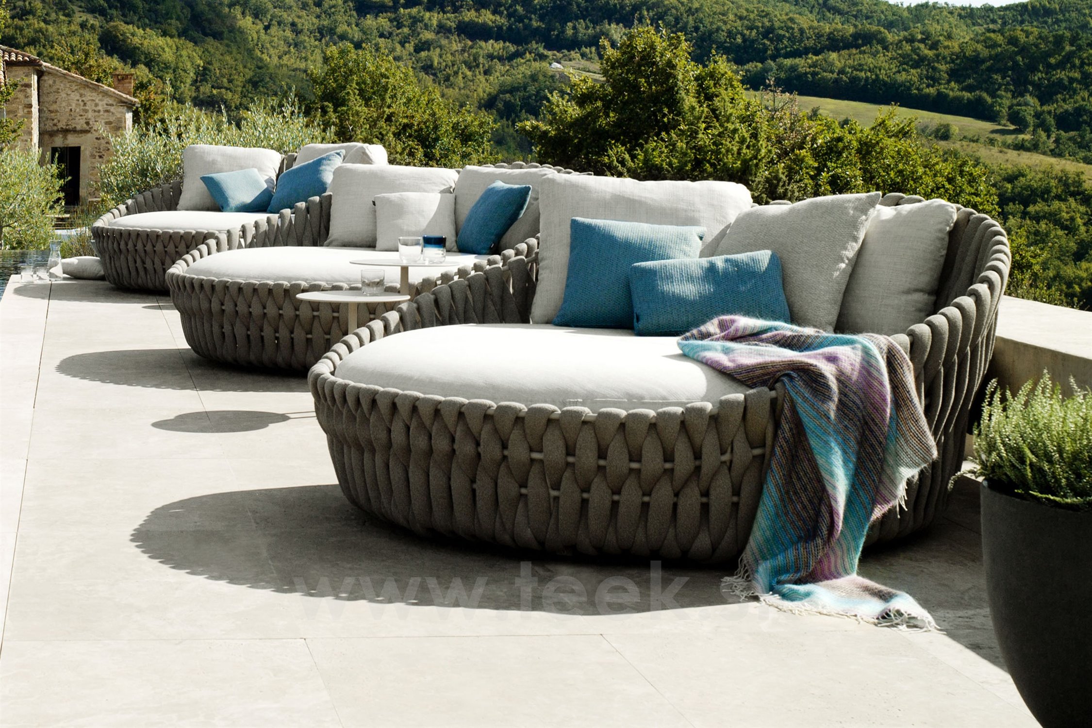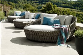 Vonkajší relaxačný nábytok Tosca od spoločnosti Tribu. Vyrobený z plneného pásového výpletu. Vankúše na sedenie a operadlo vyrobené v exteriérovej dutine.