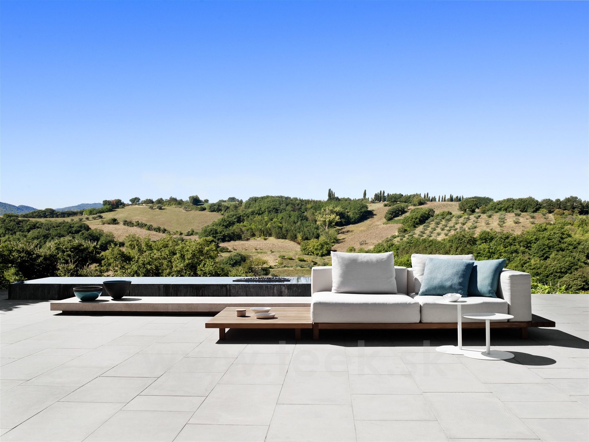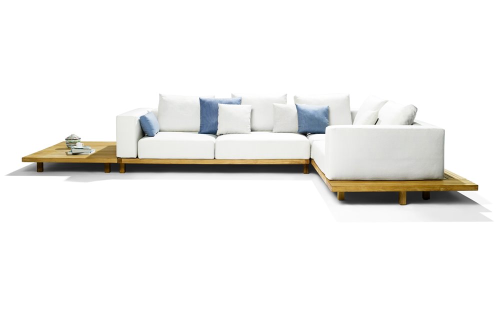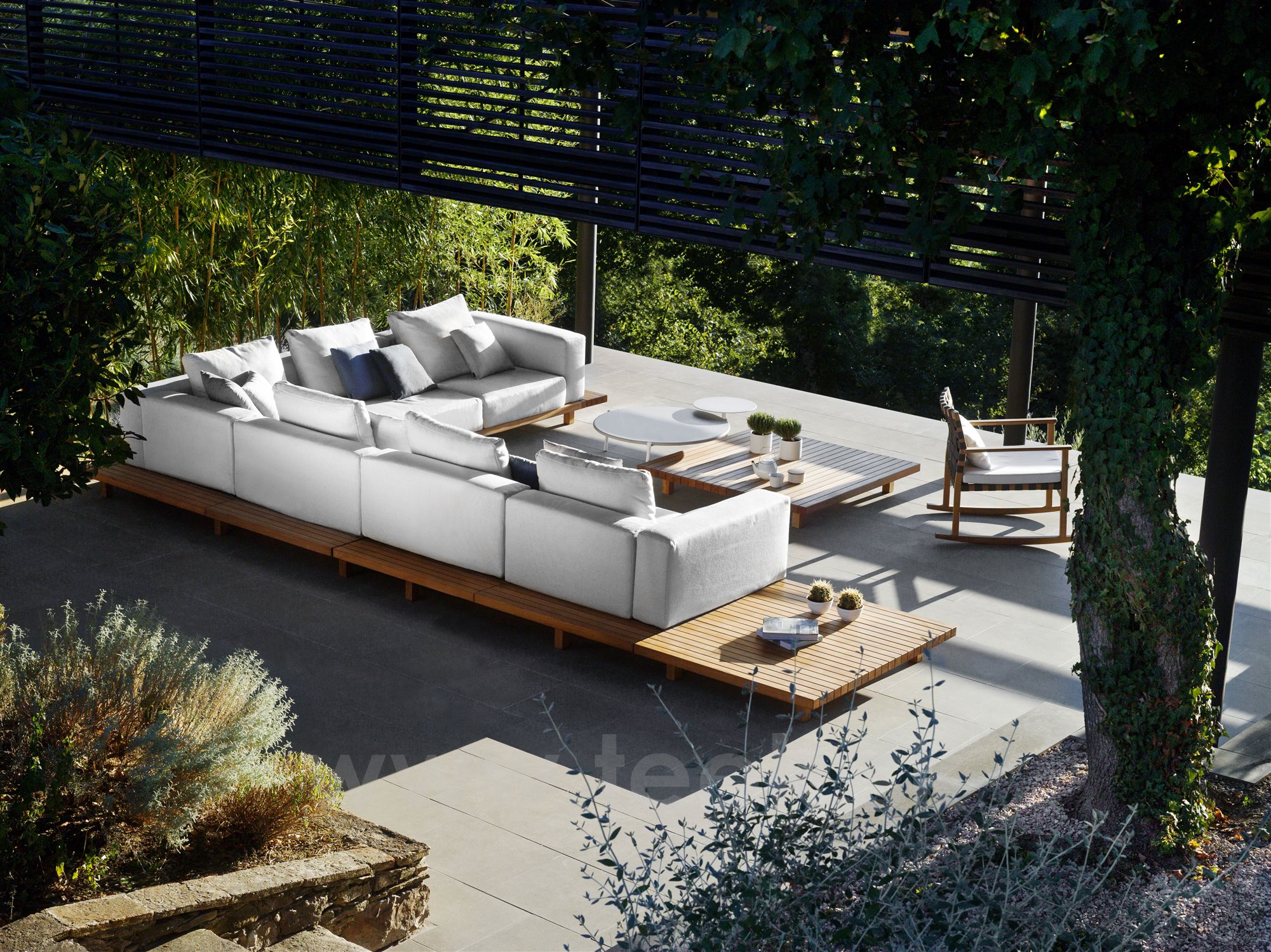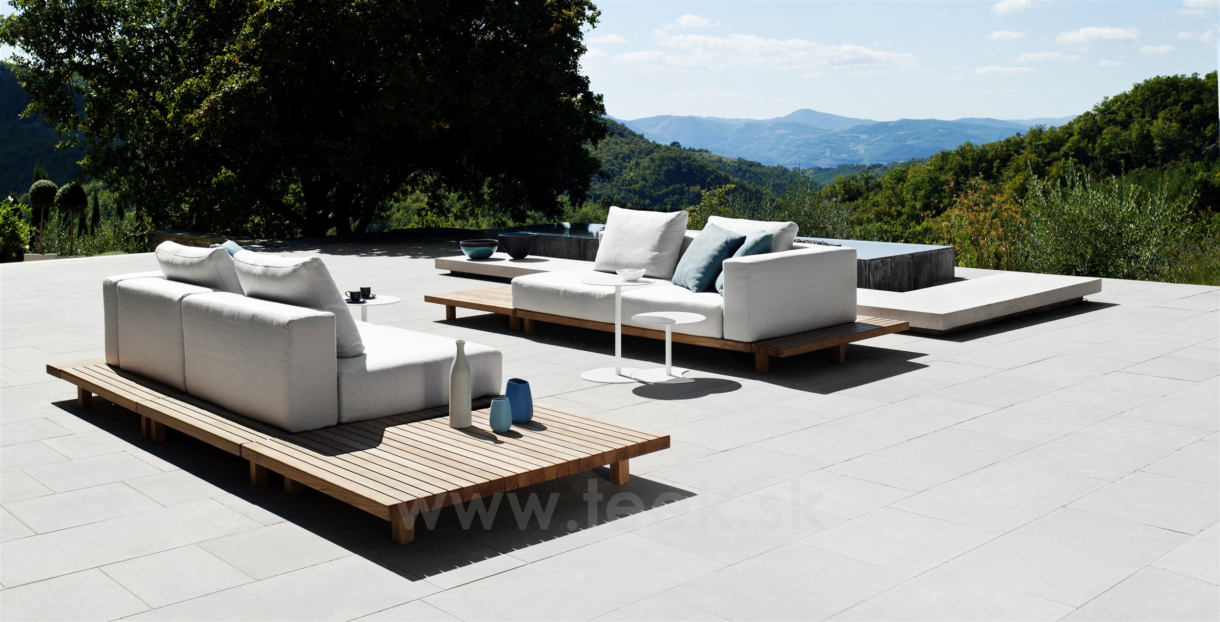 Vonkajšia modulárna sedacia súprava z teakového dreva a vonkajších sedadiel Vis a Vis od spoločnosti Tribu. Sedadlá sú vyrobené z vonkajších látok a s vodoodolnými výplňami.