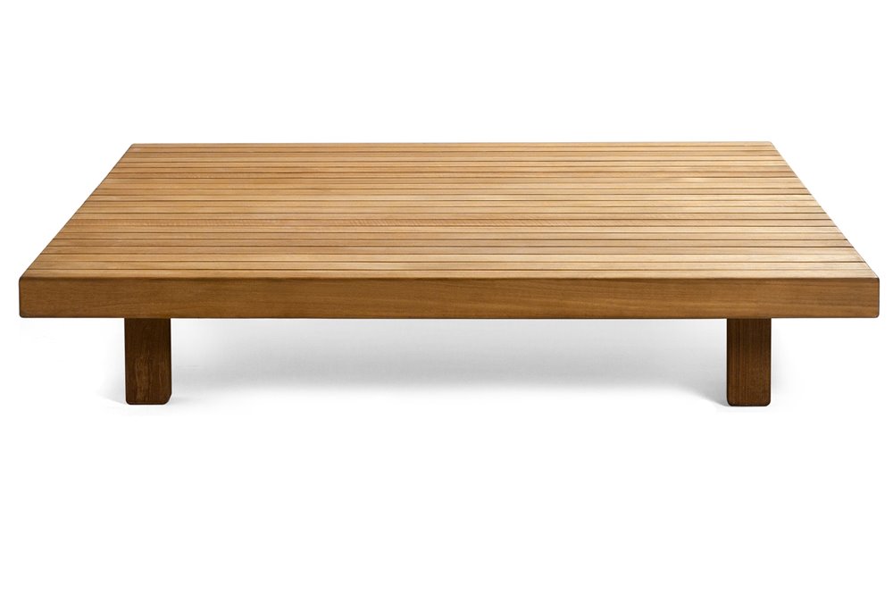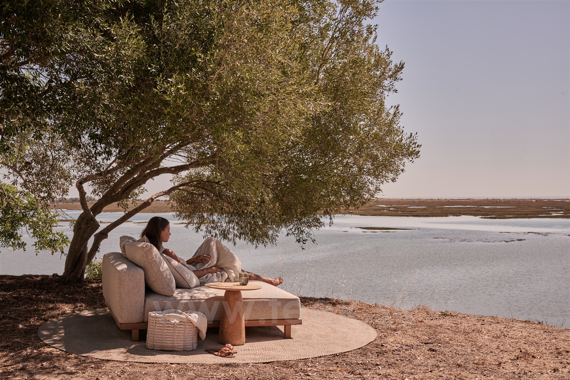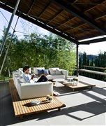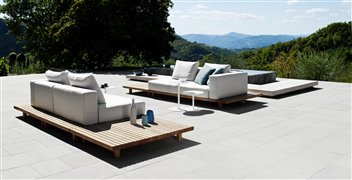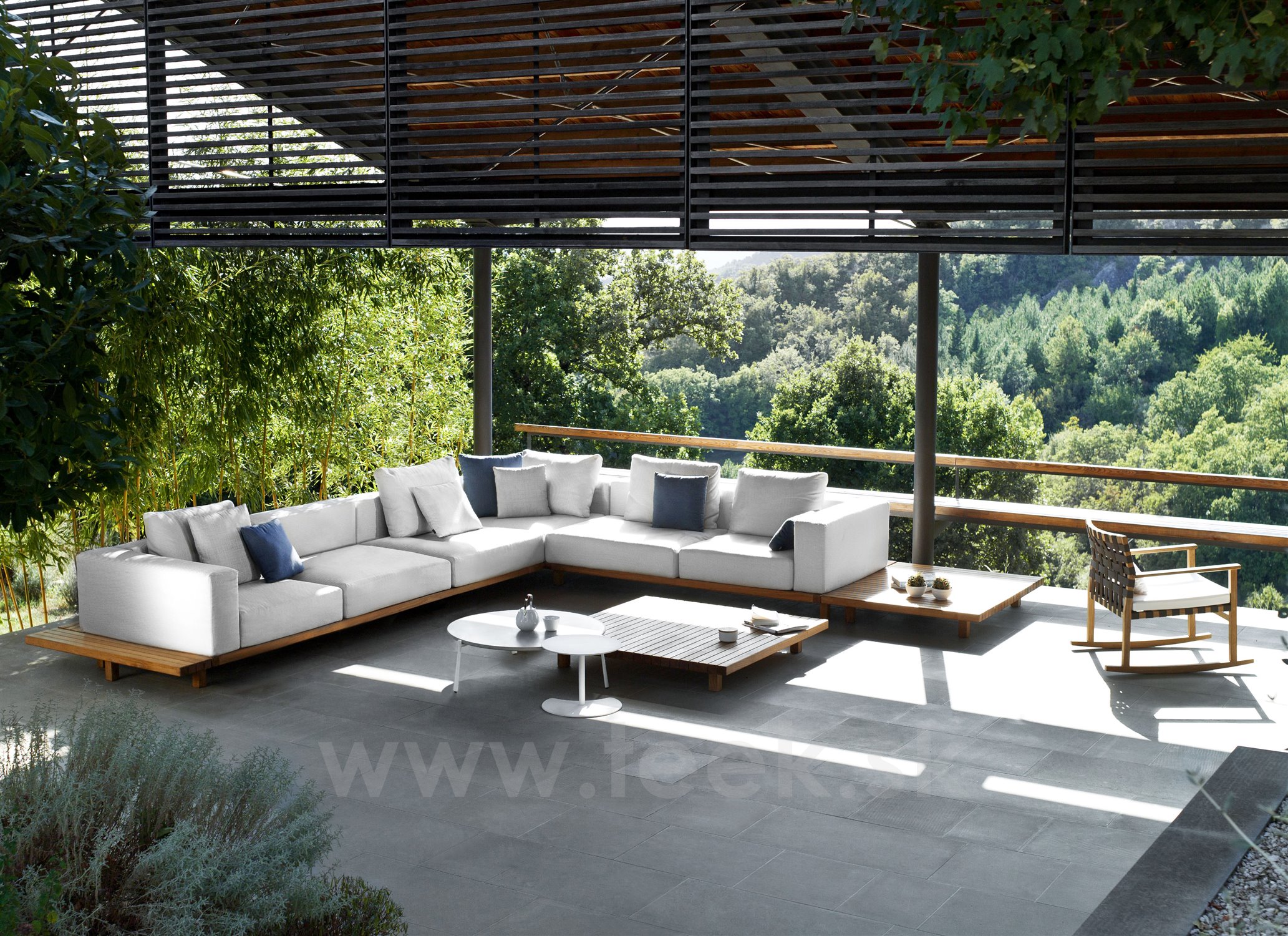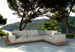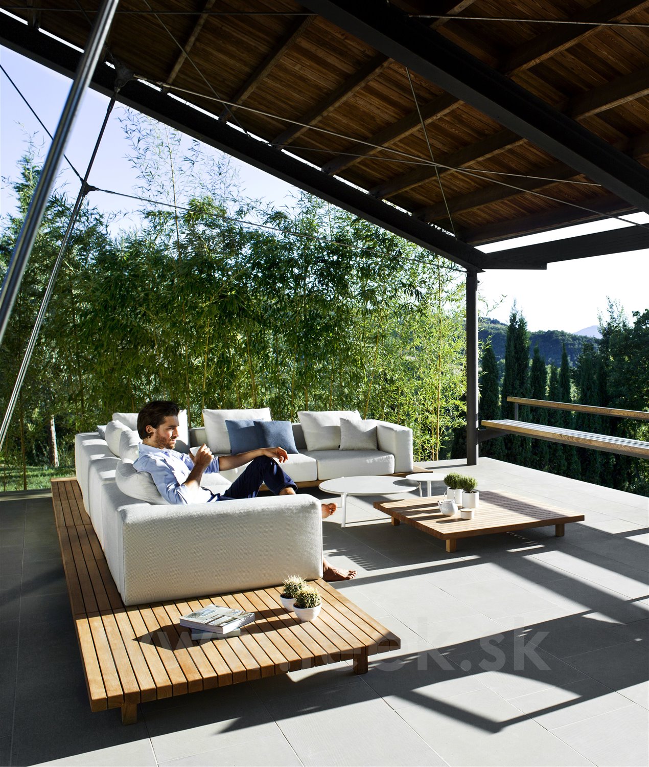 Vonkajšia modulárna sedacia súprava z teakového dreva a vonkajších sedadiel Vis a Vis od spoločnosti Tribu. Sedadlá sú vyrobené z vonkajších látok a s vodoodolnými výplňami.