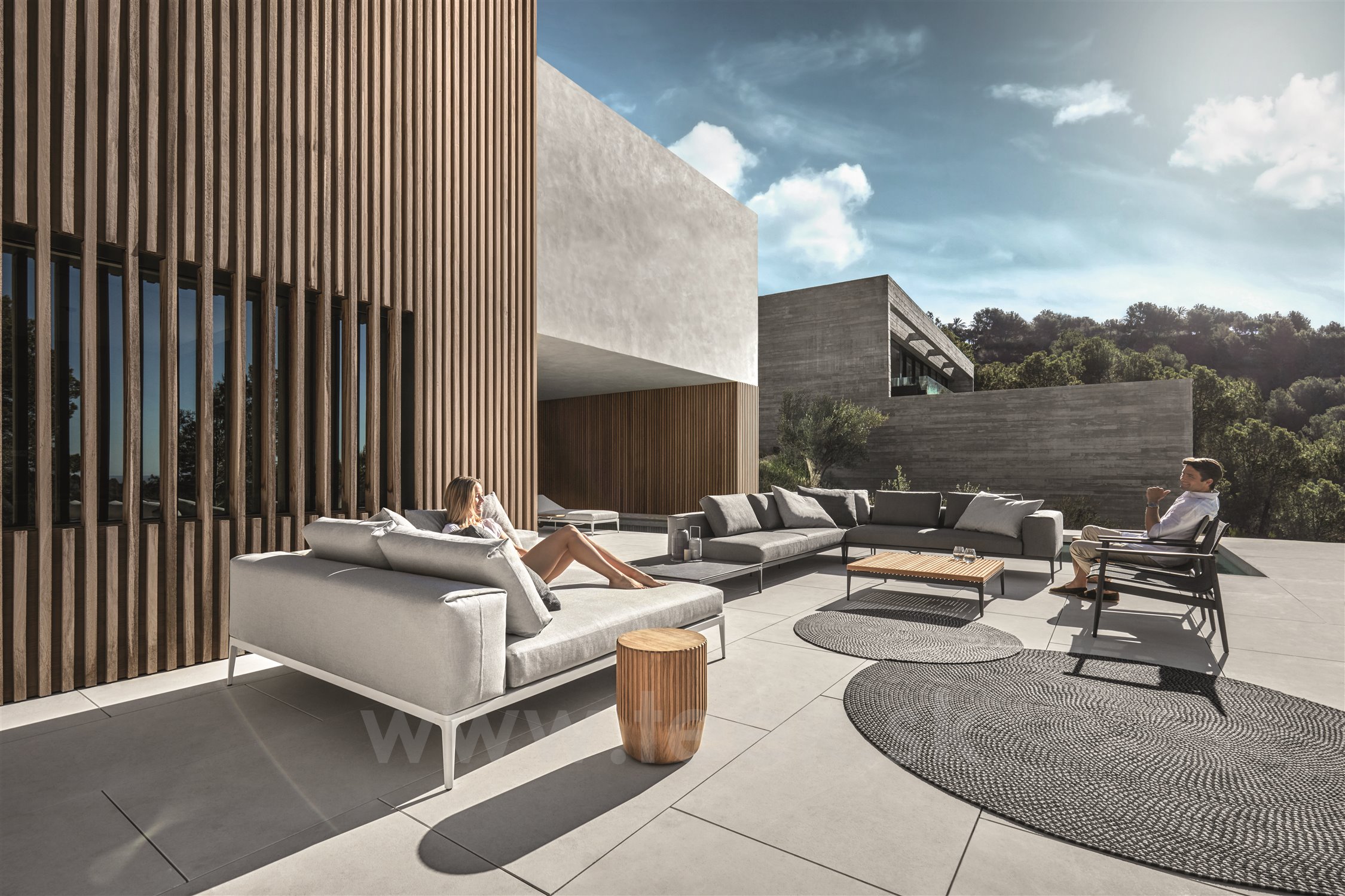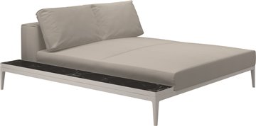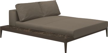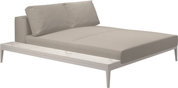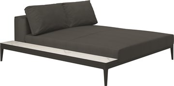 Záverečný 2-miestny relaxačný kúsok s odkladacím stolíkom v keramickej mriežke od spoločnosti Gloster slúži aj ako denná posteľ. Je súčasťou modulárnej záhradnej sedacej a relaxačnej súpravy s čalúnením z kvalitných outdoorových látok a rýchloschnúcimi výplňami na hliníkovom lakovanom ráme. Vankúše na sedenie sú určené na trvalé vonkajšie použitie. Vyberte si zo širokej ponuky farieb látok. Orientácia súpravy je možná na pravú alebo ľavú stranu. Rozmery: 180x180x85 cm, výška sedadla: 40 cm.