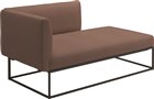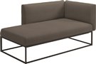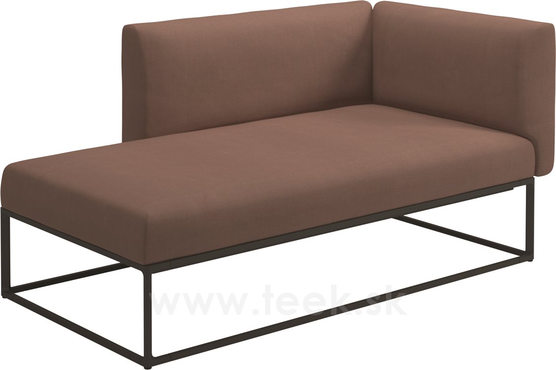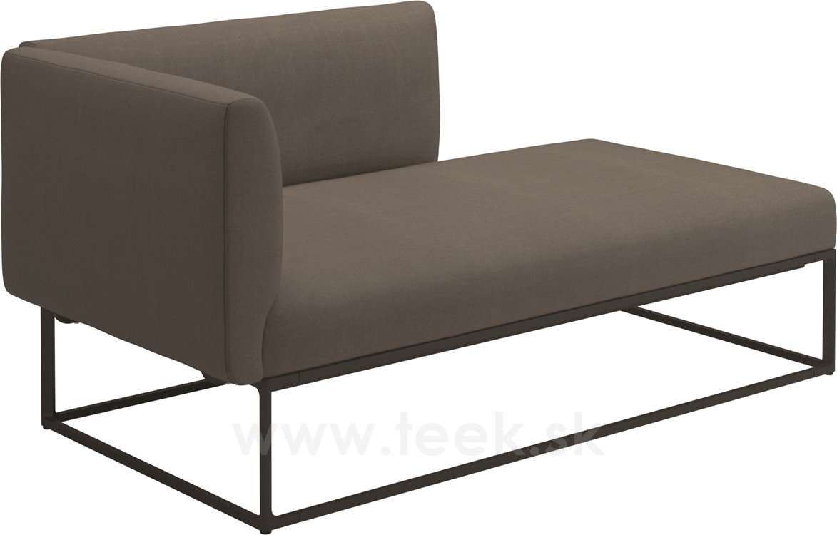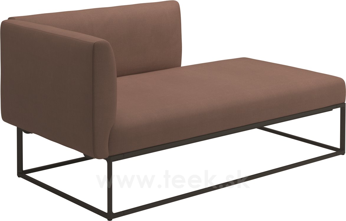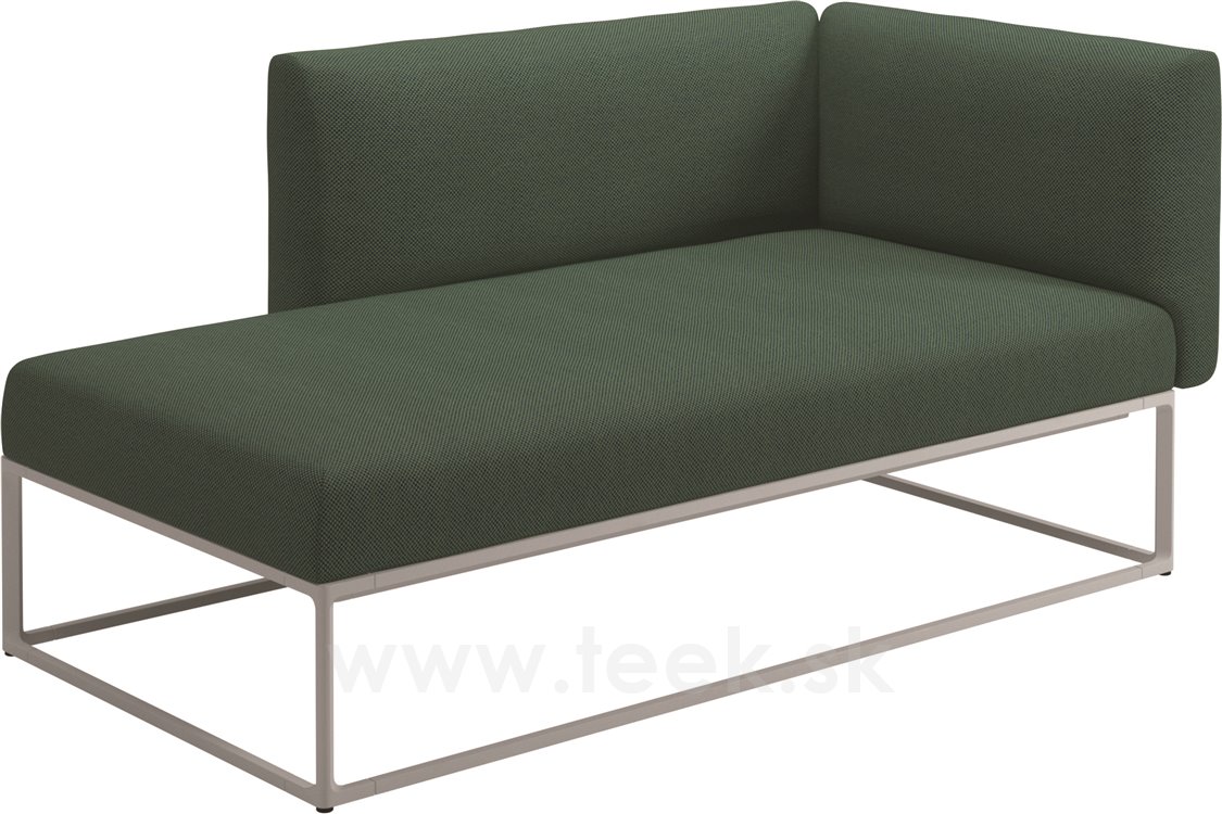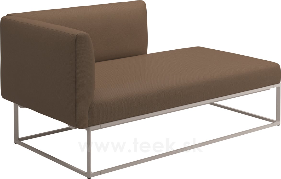 Relaxačný koncový prvok modulárnej záhradnej sedacej súpravy Maya od spoločnosti Gloster. Konštrukcia dielu je vyrobená z lakovaného hliníka, čalúnenie je z vonkajších odolných látok. Výplne sú vyrobené z rýchloschnúcej peny, takže diel môže byť vonku po celý rok.