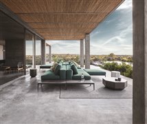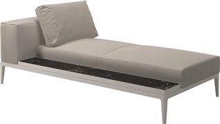 Relaxačný koncový prvok s odkladacím stolíkom z keramiky (farba podľa vzorkovníka) Grid by Gloster. Súčasť modulárnej záhradnej sedacej a relaxačnej súpravy s čalúnením z kvalitných outdoorových látok a rýchloschnúcimi výplňami na hliníkovom lakovanom ráme. Vankúše na sedenie sú určené na trvalé vonkajšie použitie. Vyberte si zo širokej ponuky farieb látok. Orientácia súpravy je možná na pravú alebo ľavú stranu.