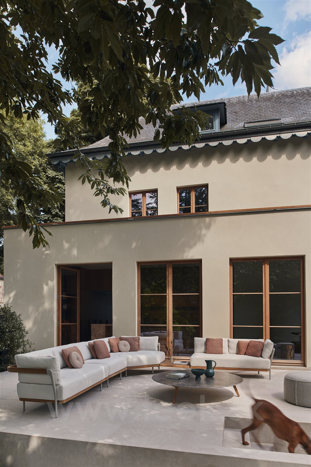 Ukončovací pravostanný 2-místný díl k modulové zahradní sedací sestavě Flows značky Manutti. Díl má rám z teakového dřeva a hliníku, polstrování je z venkovních odolných látek