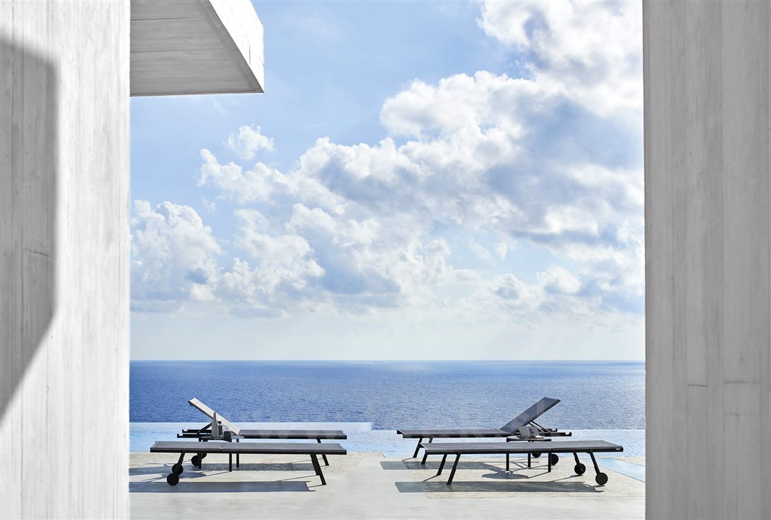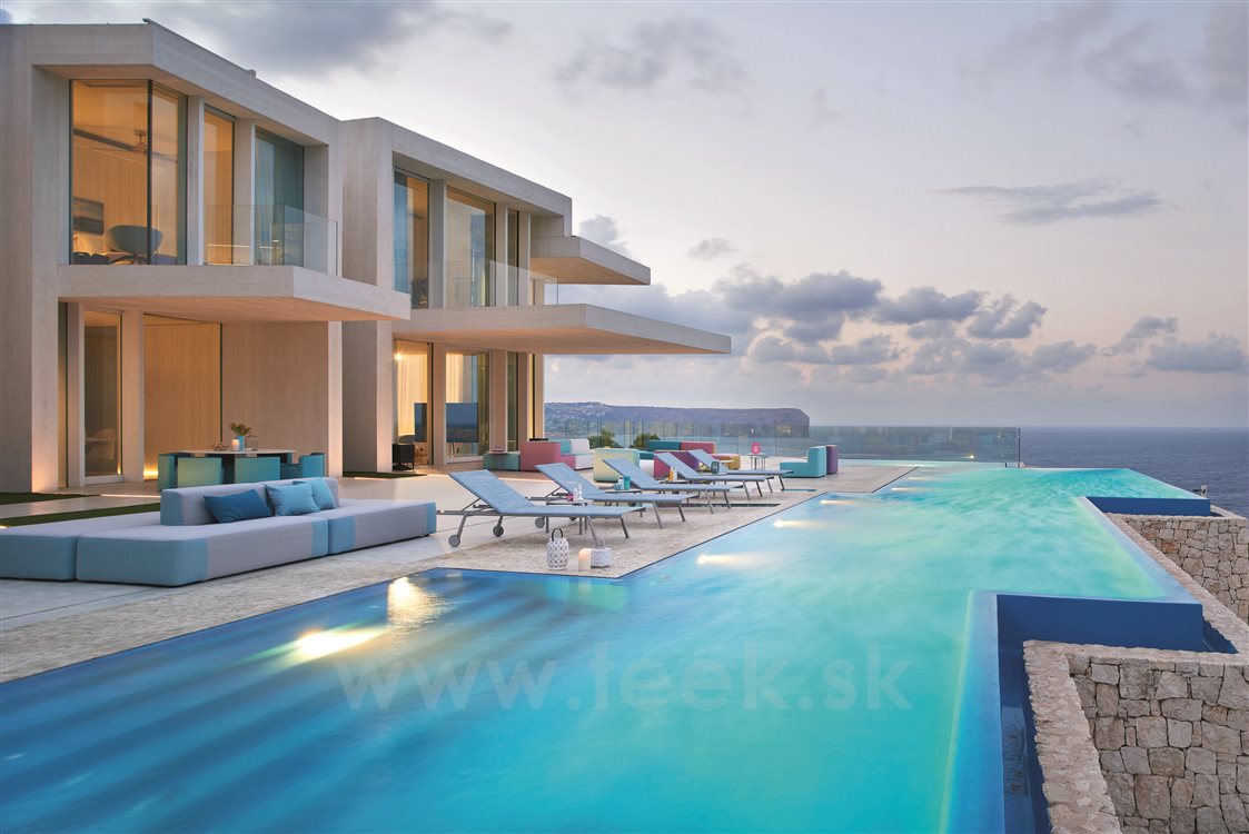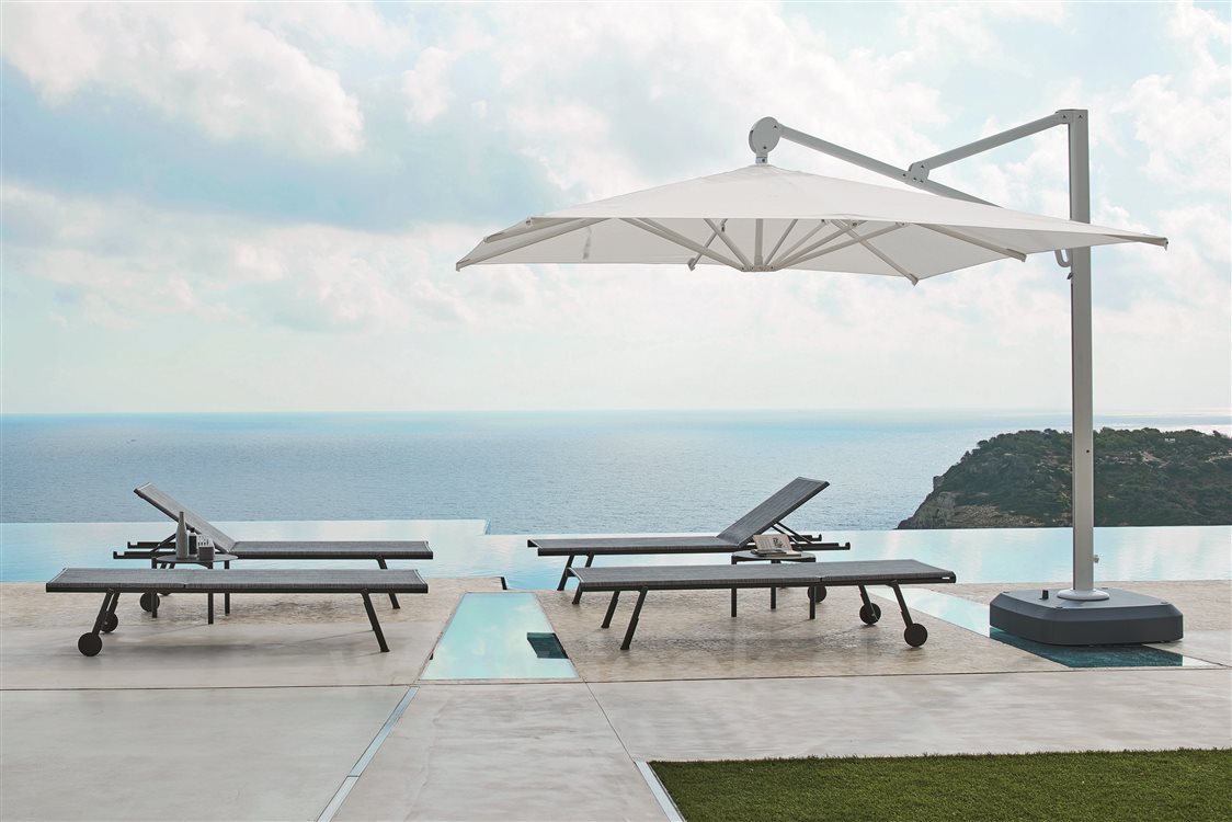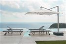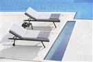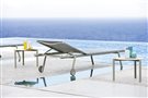 Kolekcia relaxačného záhradného nábytku Bahia od spoločnosti Varaschin. Kolekcia obsahuje ležadlo na opaľovanie alebo pri bazéne a záhradný stôl.