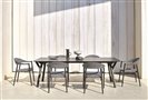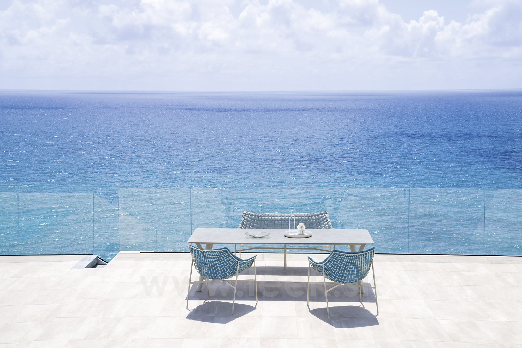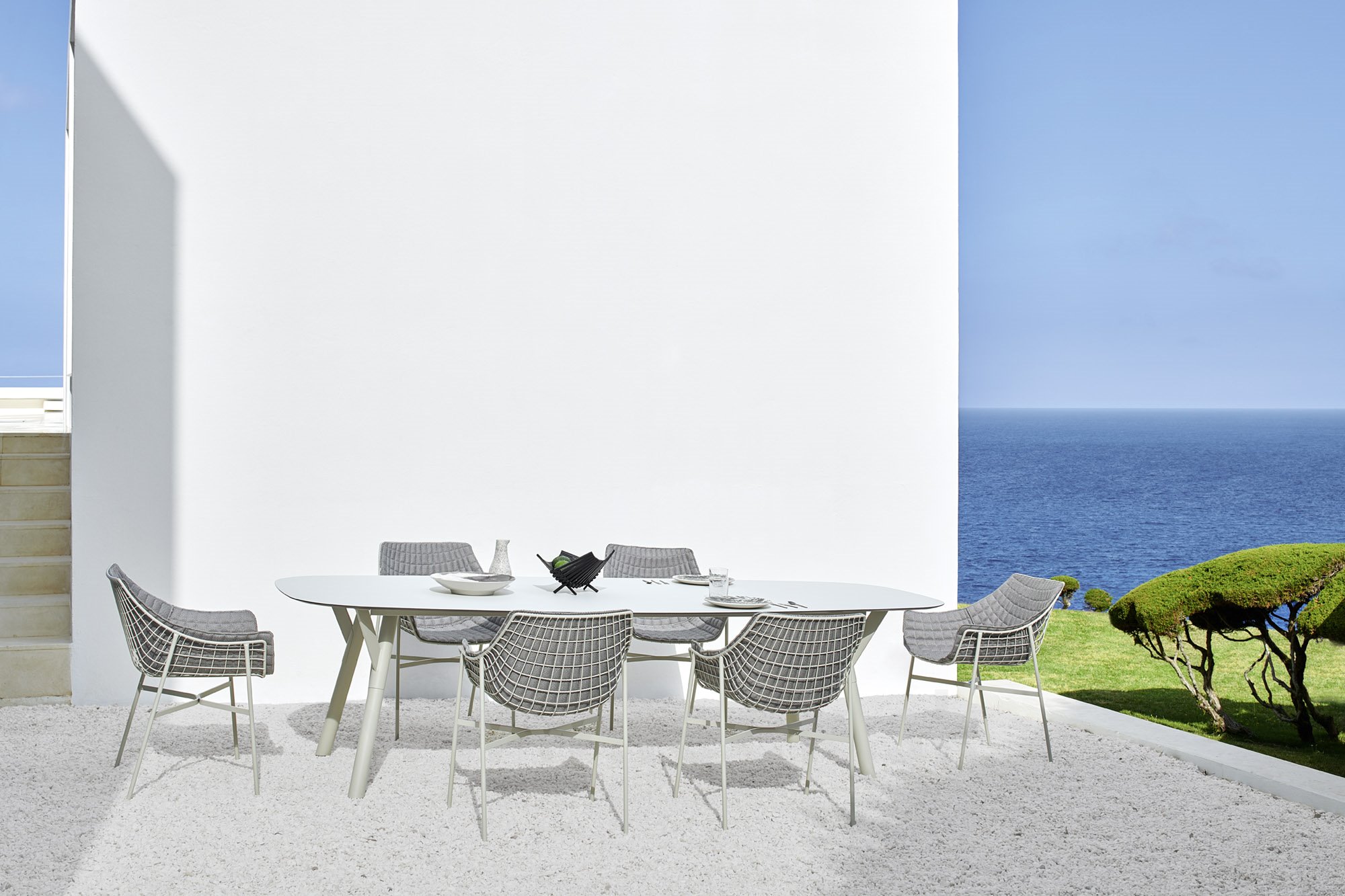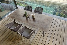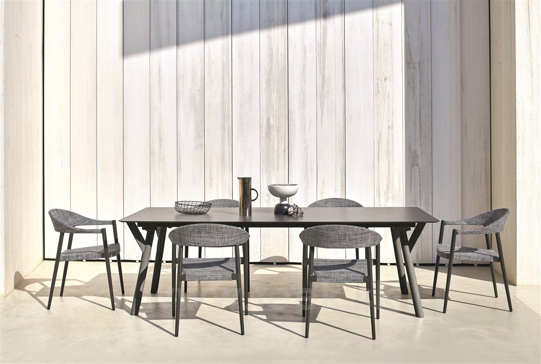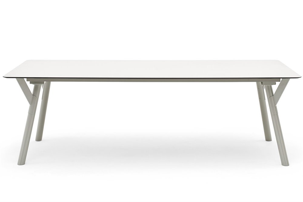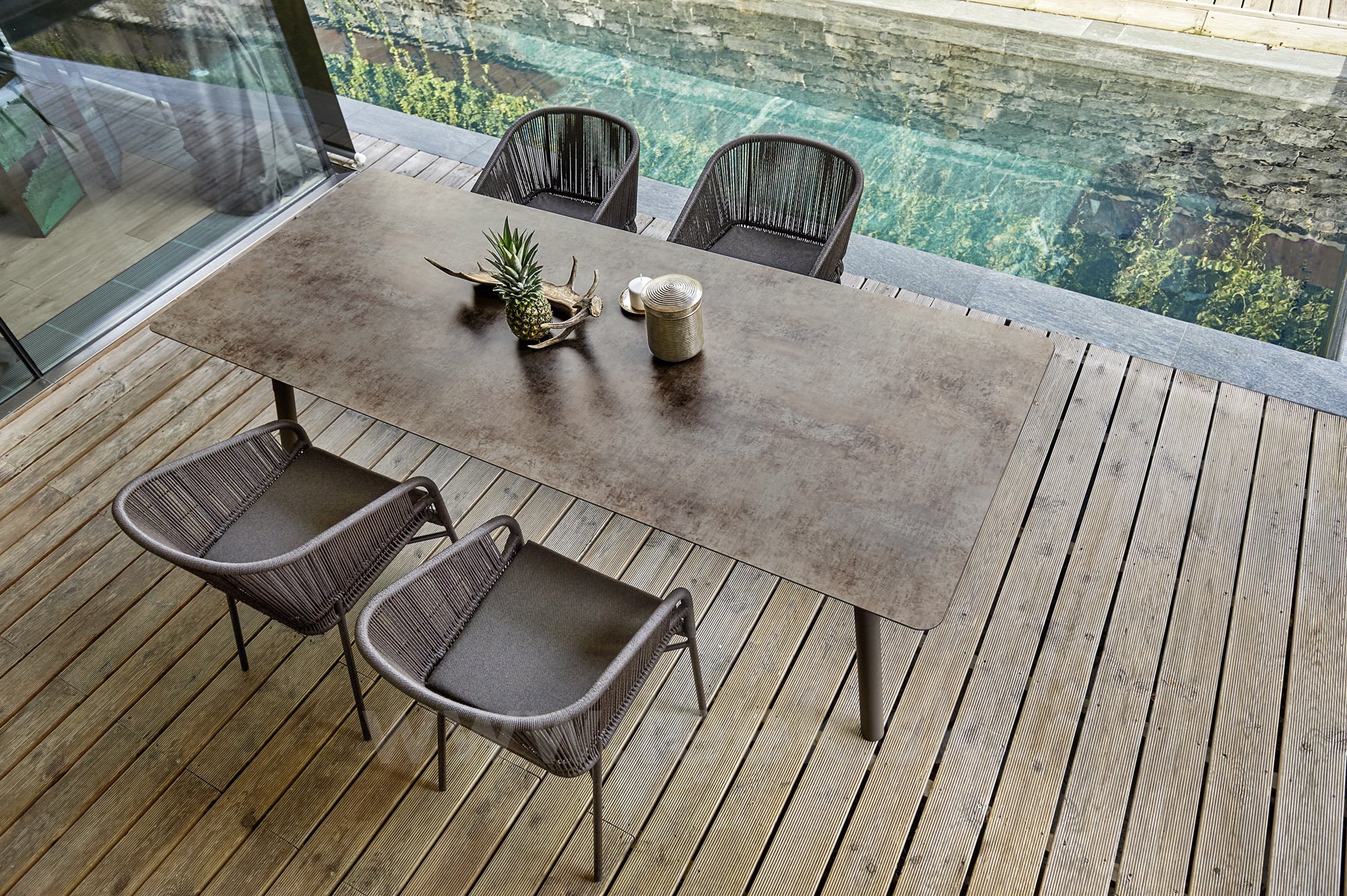 Link collection of garden dining tables by Varaschin. The garden tables have a painted stainless steel construction and a top made of high pressure laminate (HPL), ceramic or teak. Available in a range of sizes. In addition to fixed dining tables, folding dining tables can also be purchased.