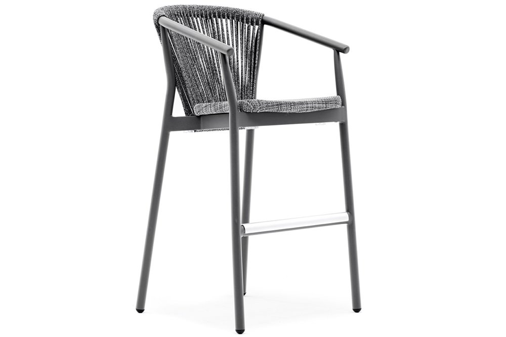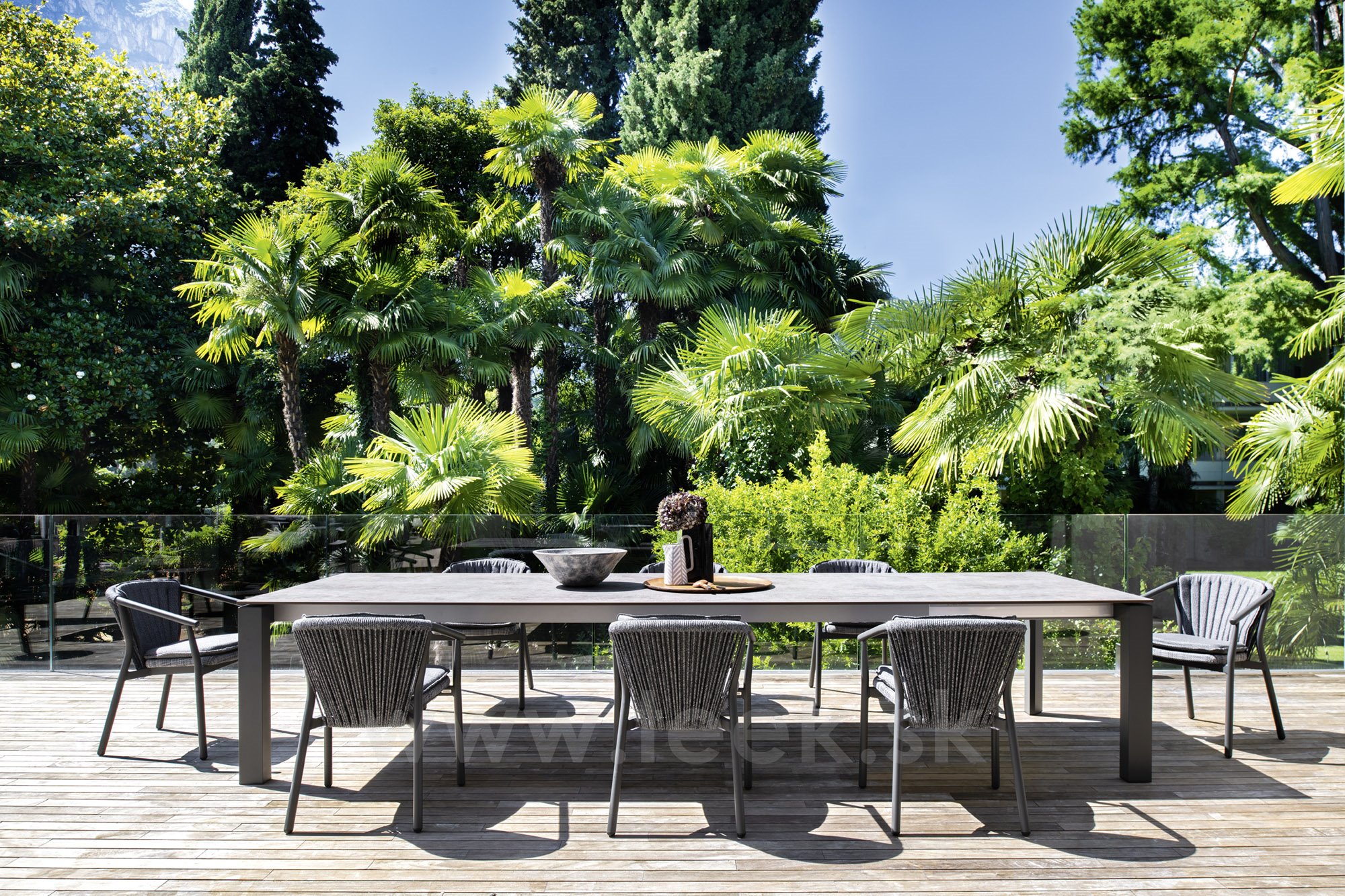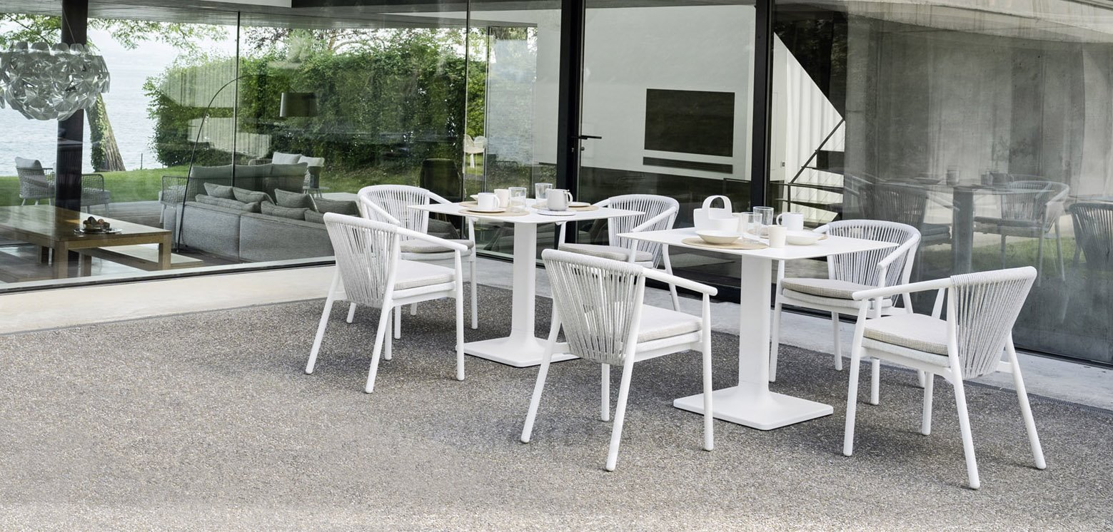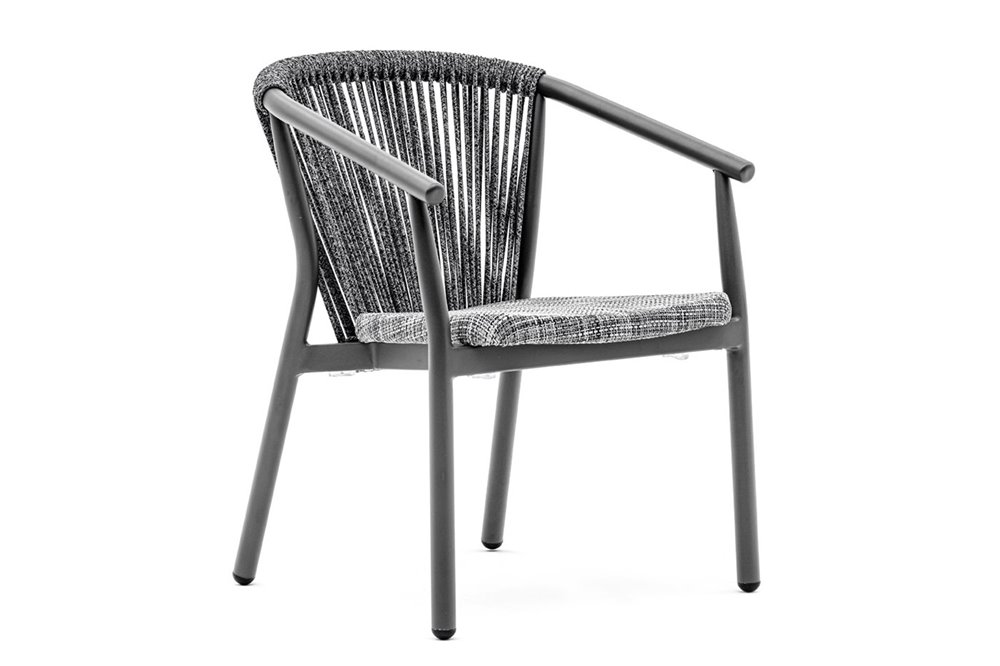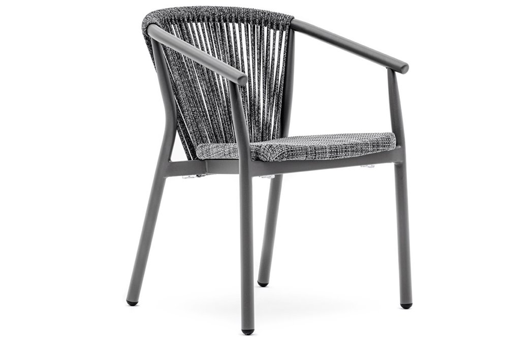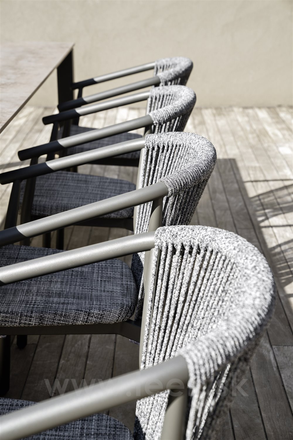 The frames of the dining furniture are made of aluminium, the backrest is made of wire weave and the seat is made of textile.