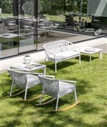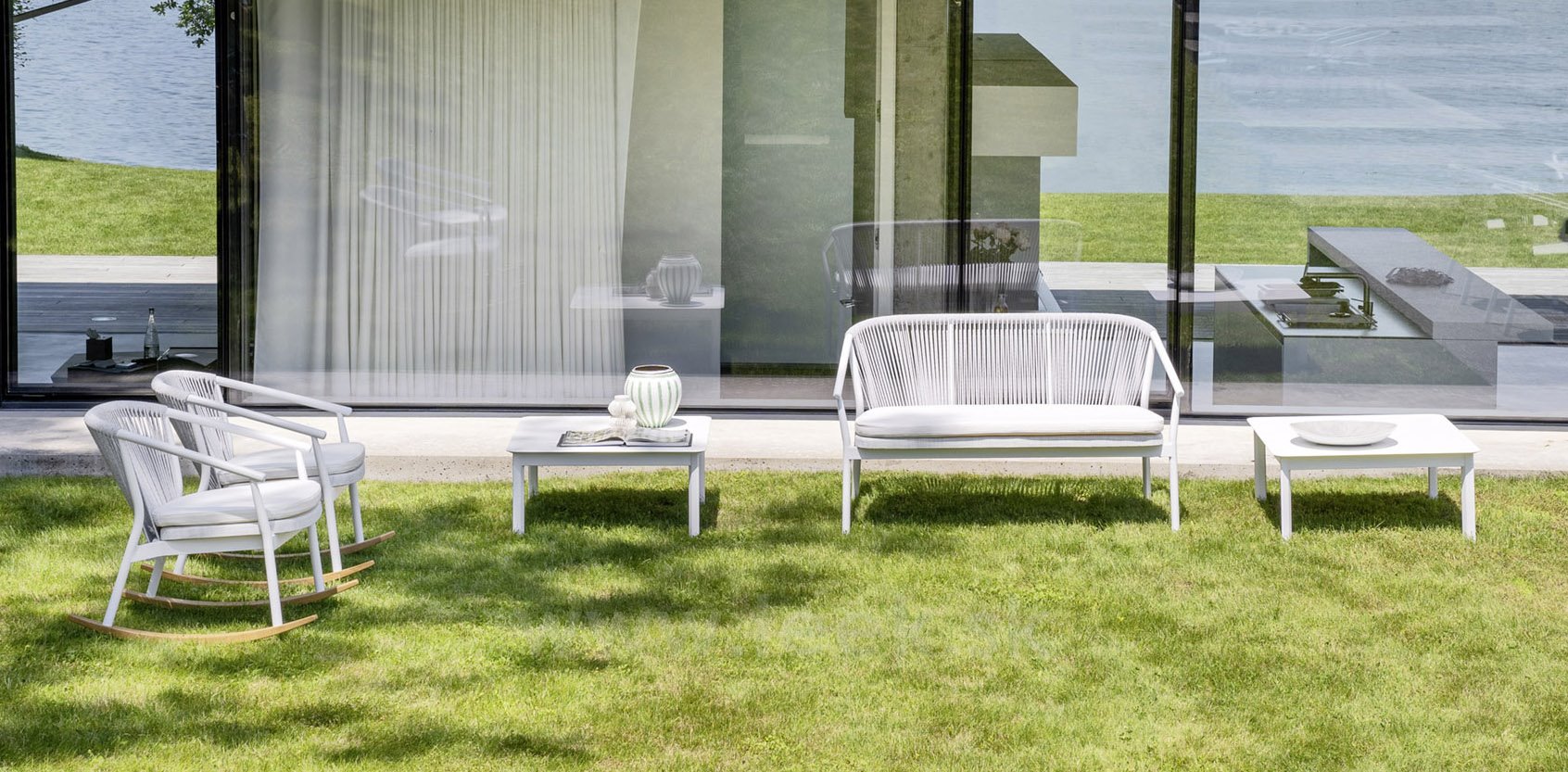 Rámy sedacieho nábytku sú vyrobené z hliníka, operadlo je vyrobené z drôteného výpletu a sedadlo je vyrobené z textilu.