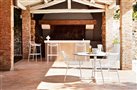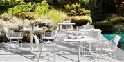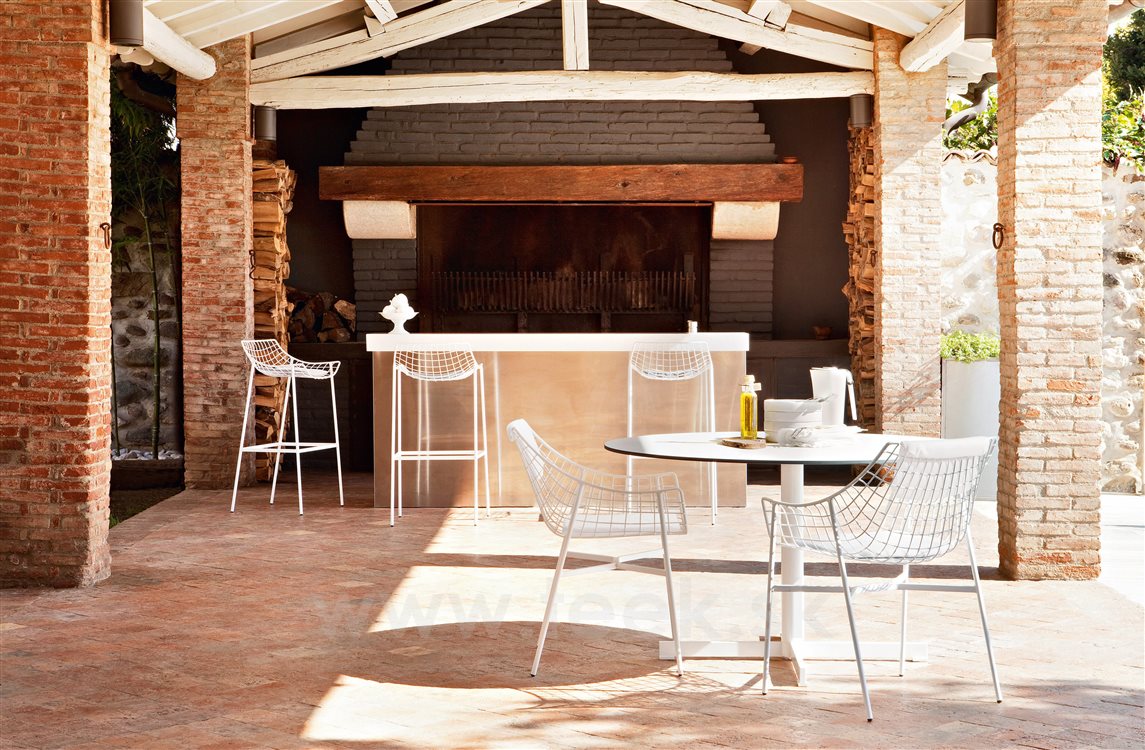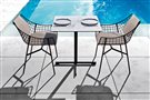 Záhradný jedálenský a barový nábytok Letný set od Varaschin. Kovový záhradný nábytok obsahuje jedálenskú stoličku, jedálenskú stoličku a barové stoličky v dvoch výškach.