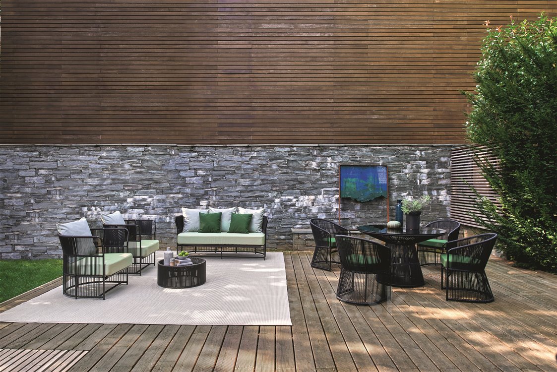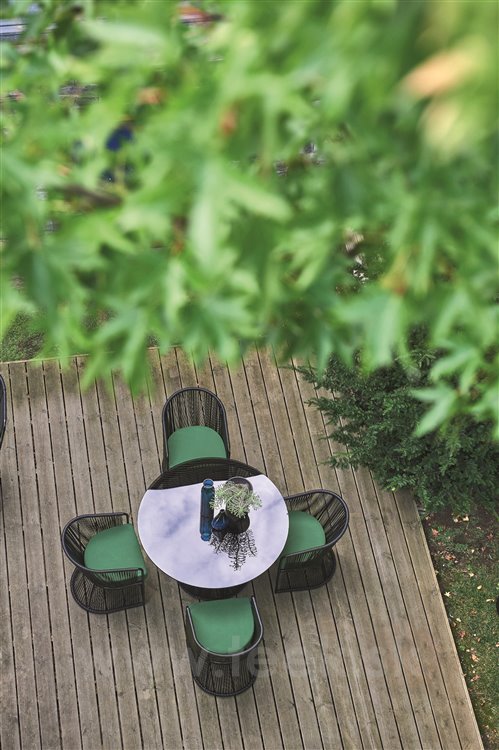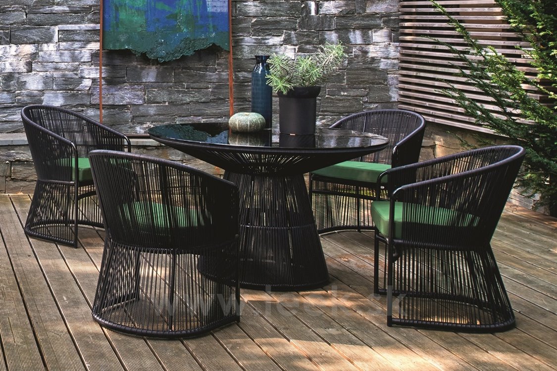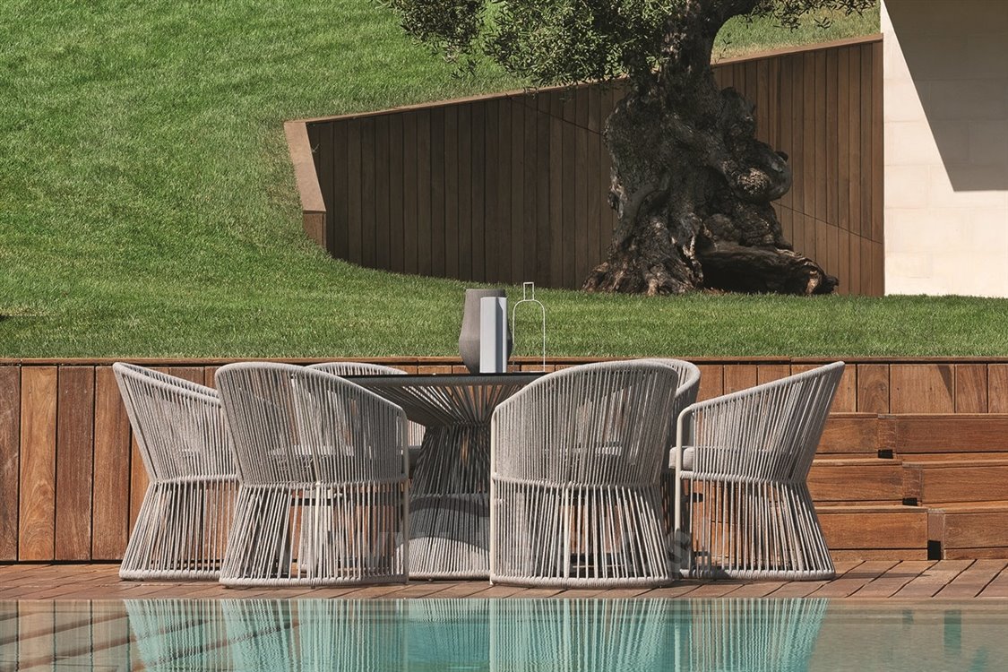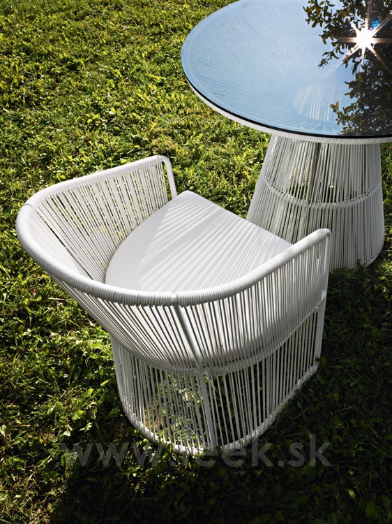 Kolekcia záhradného jedálenského nábytku Tibidabo od spoločnosti Varaschin. Konštrukcia záhradného nábytku je vyrobená z lakovaného hliníka s káblovým výpletom.