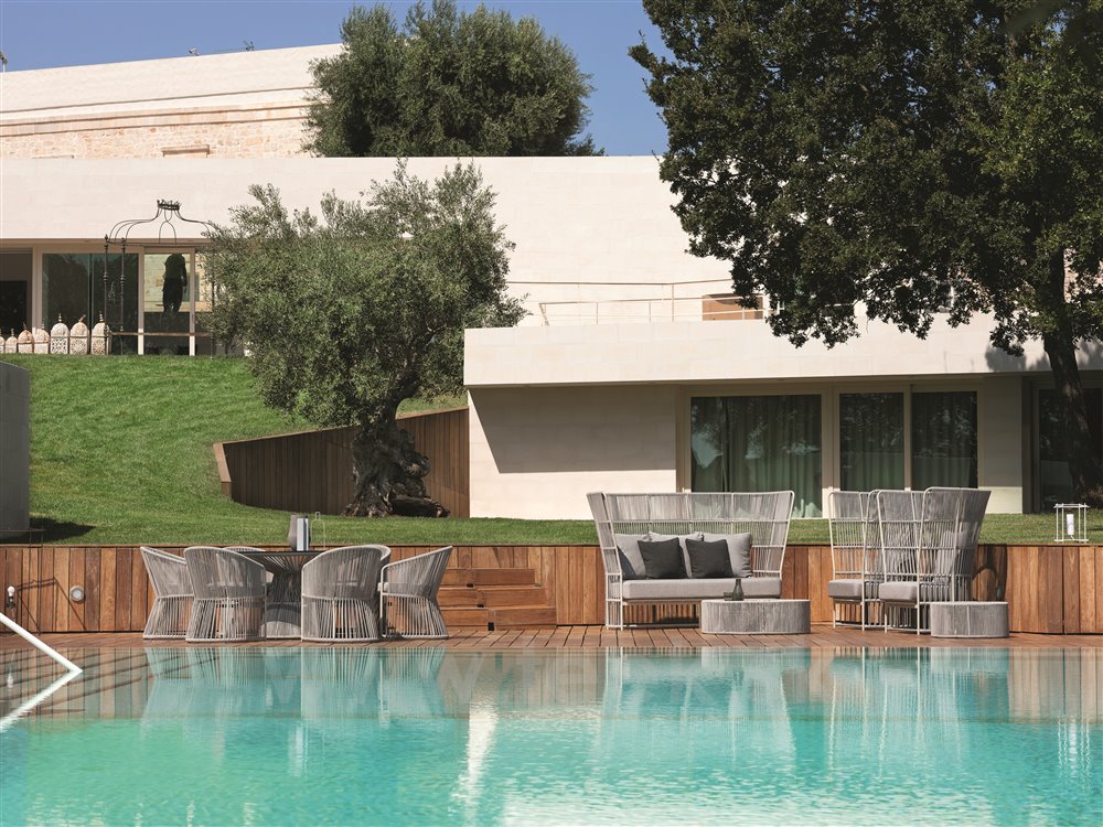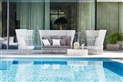 Kolekcia obsahuje nízke kreslá, záhradné pohovky, konferenčné stolíky a kvetináč.