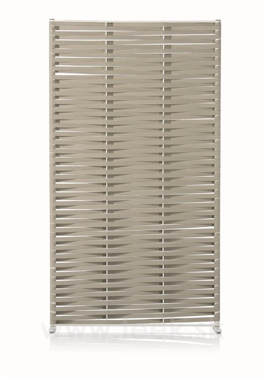 Venkovní paraván (mobilní zástěna) Wing značky Roda. Paraván má lakovaný nerezový lakovaný rám a výplet z pásů. Základní panel má rozměry: 120x183x40 cm (D x V x H) - udaná hloubka je délka stojné nohy. K paravánu lze doobjednat rozšiřující díly (každý díl ve stejném rozměru jako základna)