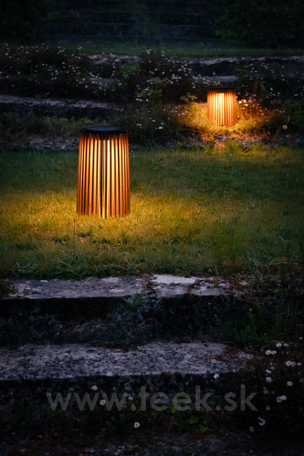 Lucerna má rám z lakovaného hliníku a teakového dřeva.