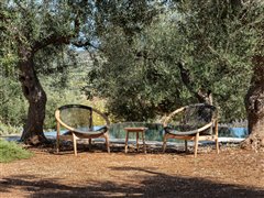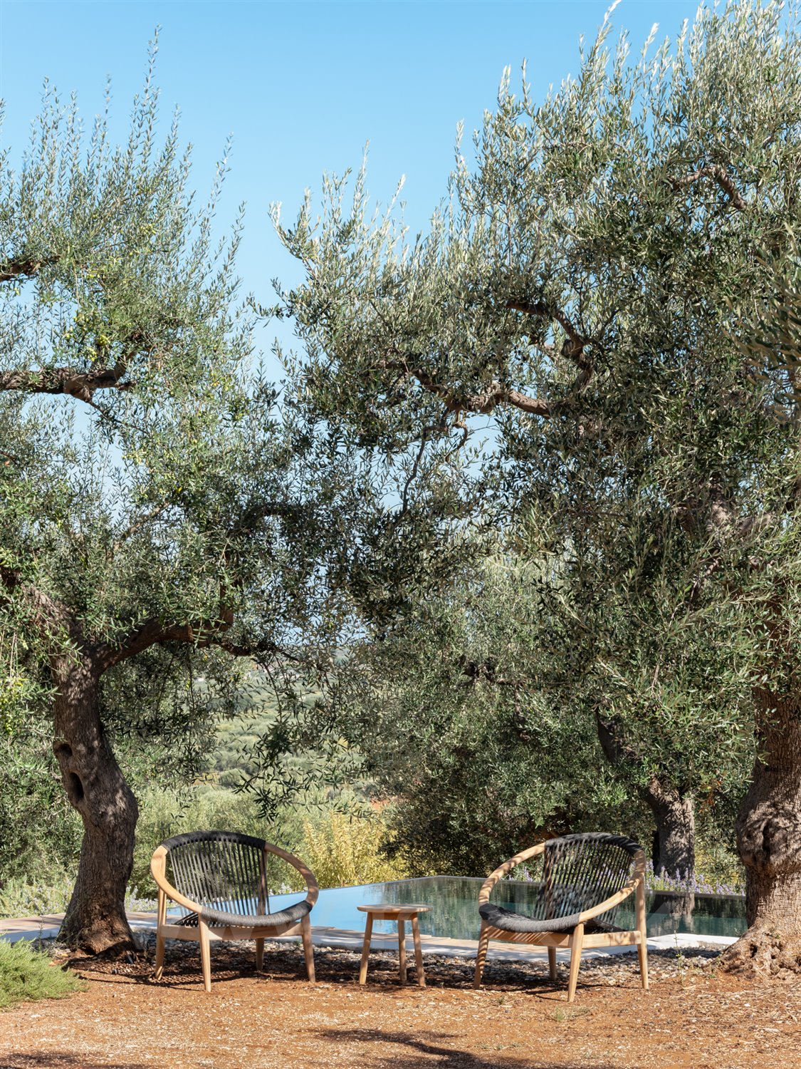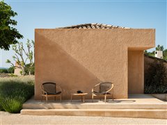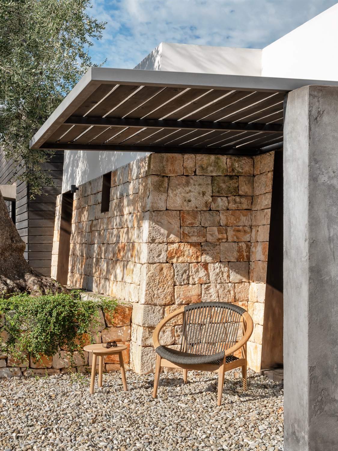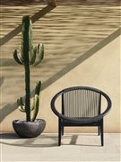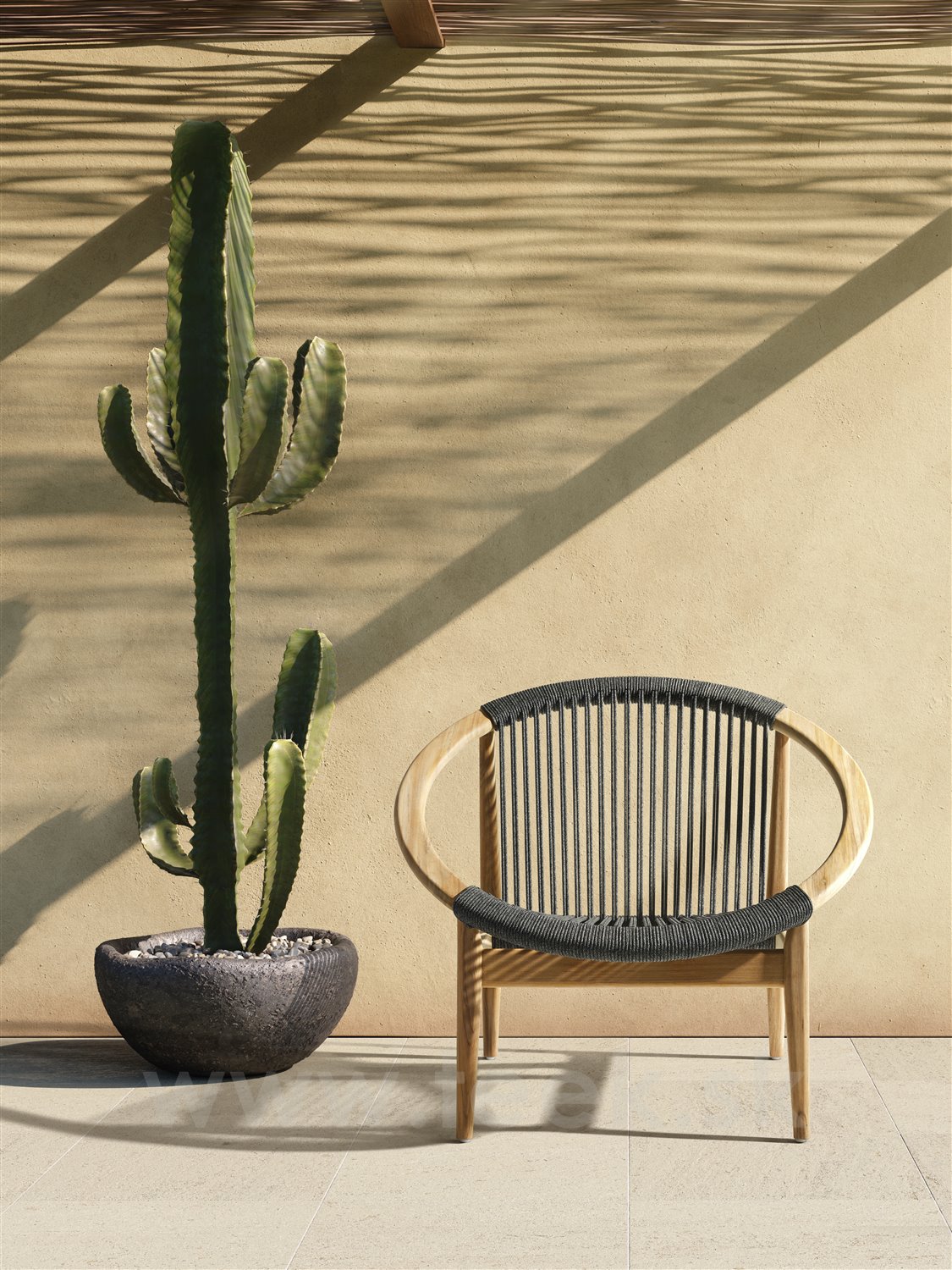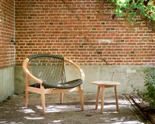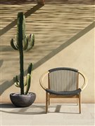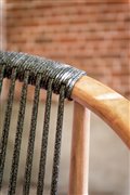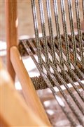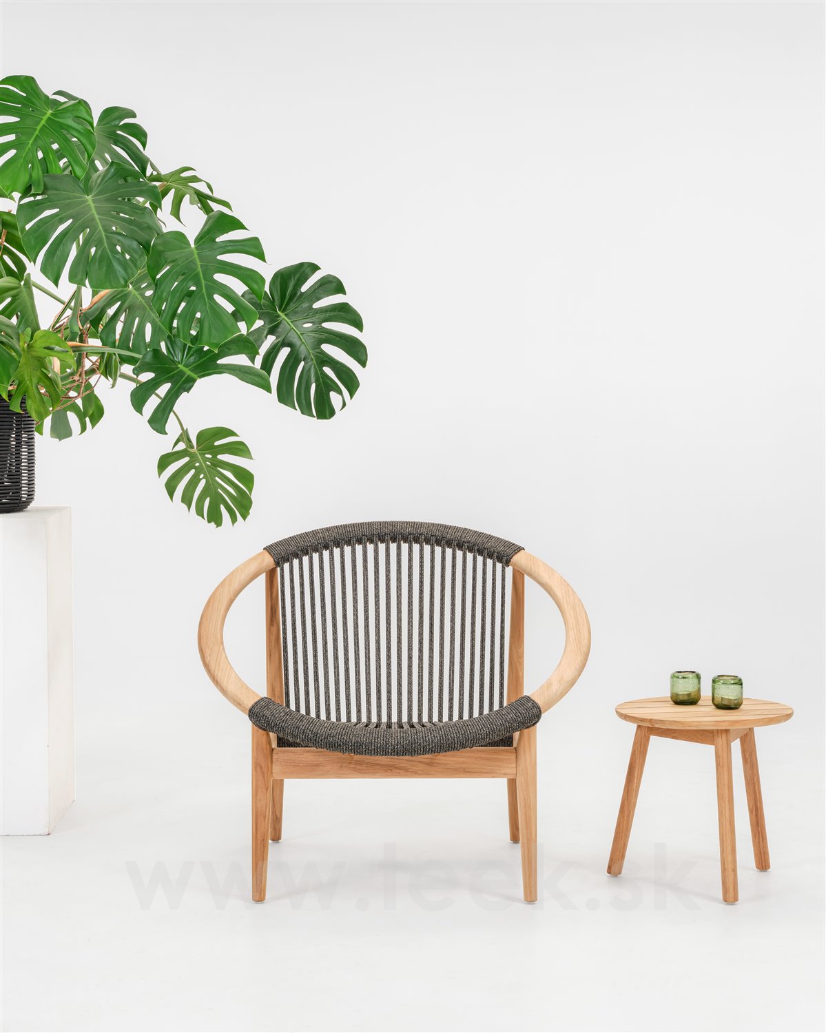 Nízké kreslo z teakového dreva s tenkým lankovým výpletom.