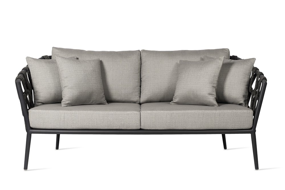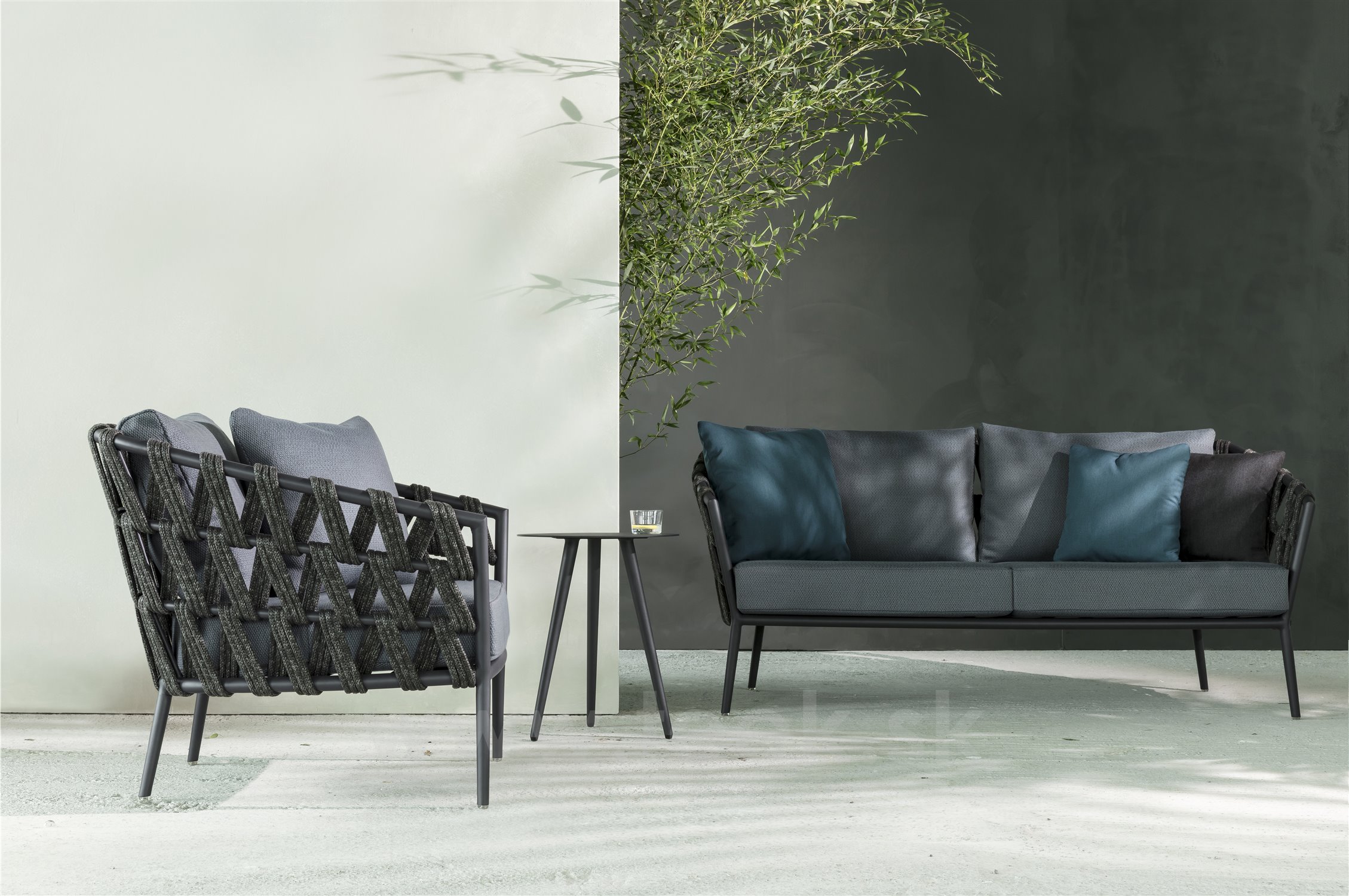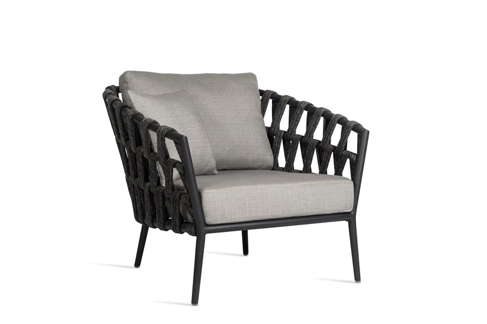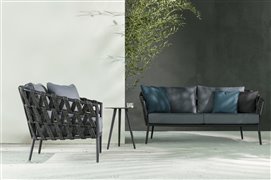 Dizajnová sedacia zostava z lakovaného hliníka a lankového výpletu.