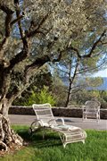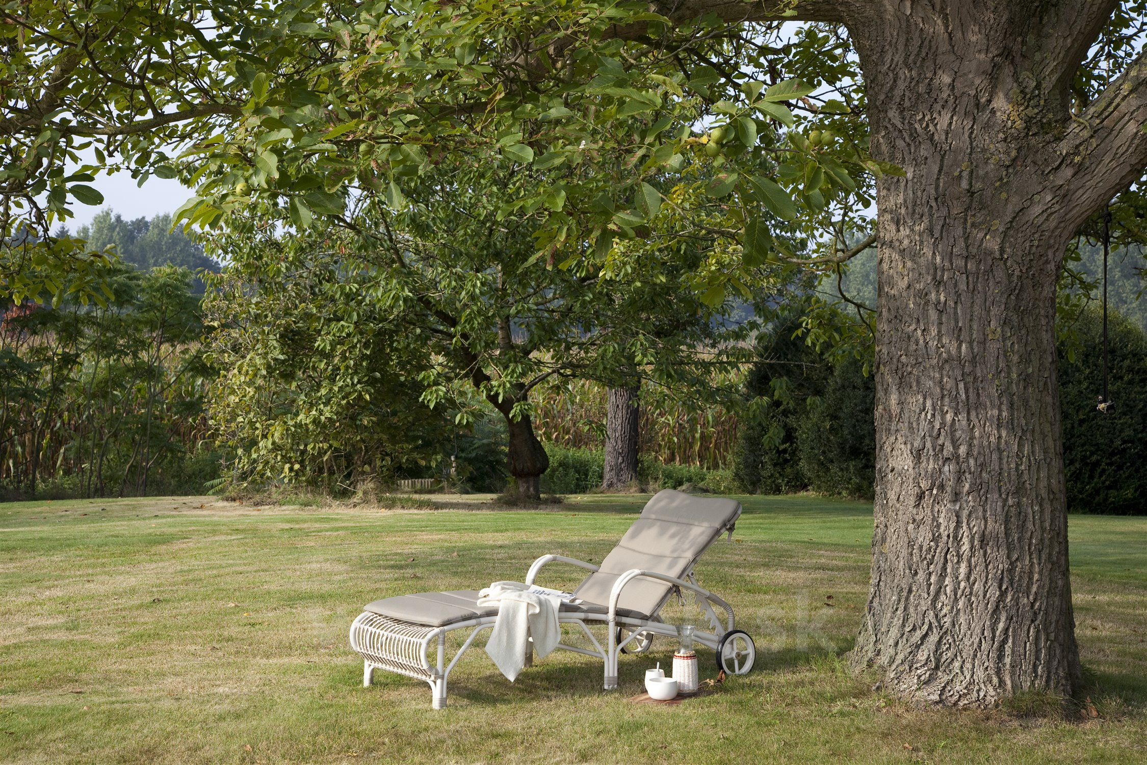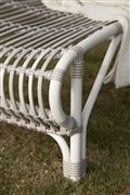 Polohovateľné ležadlo z lakovaného hliníka s výpletom z umelého ratanu.