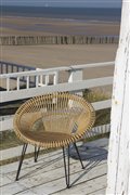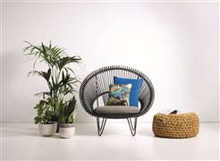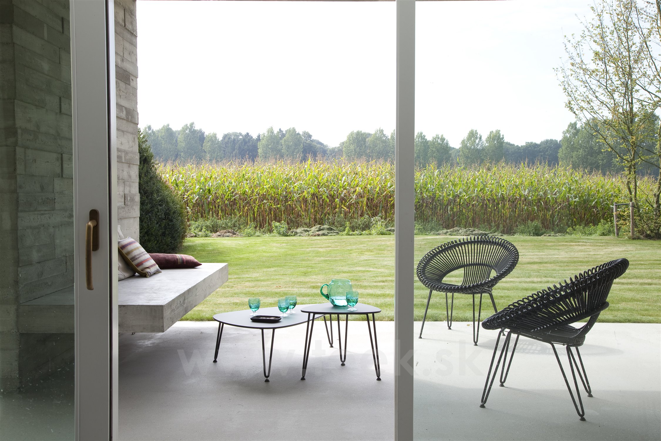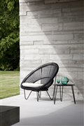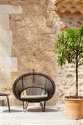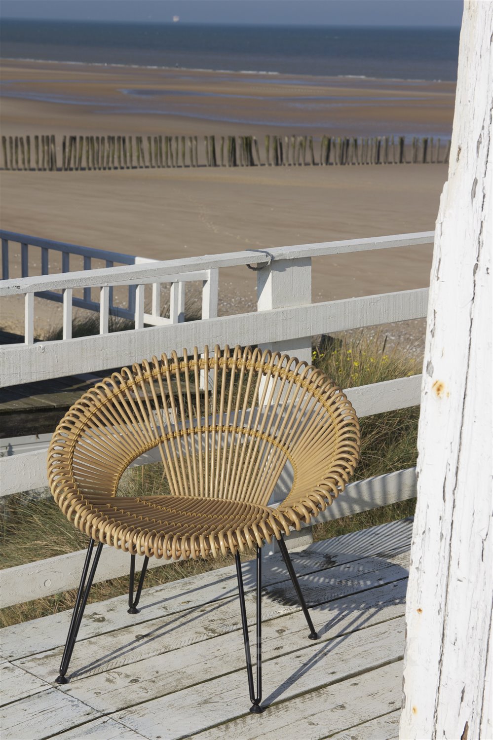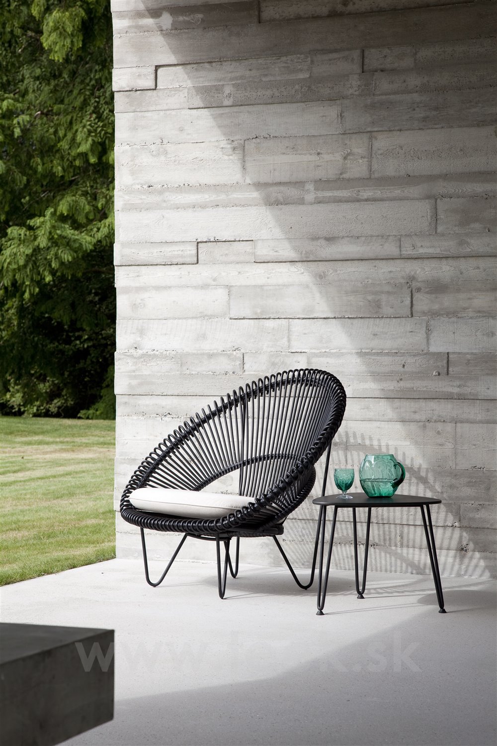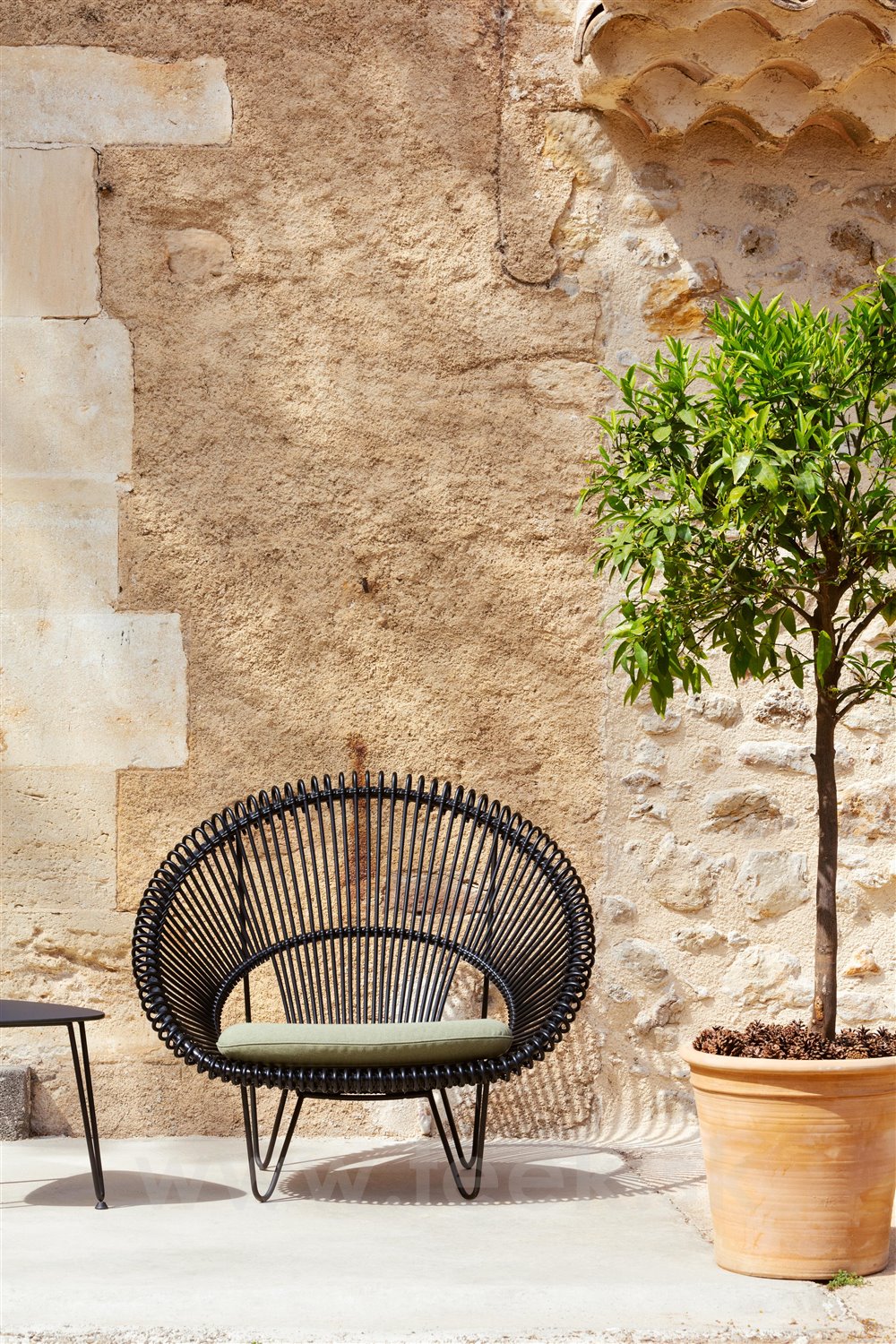 Low and relaxing armchairs made of lacquered steel and synthetic rattan.