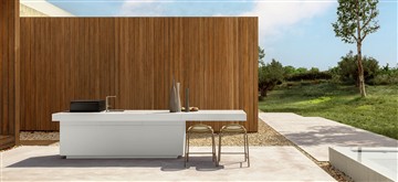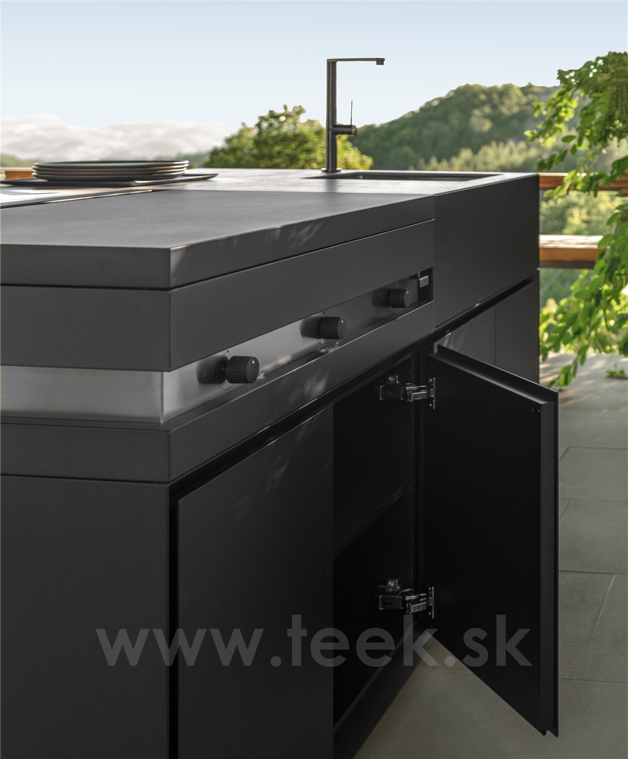 - Modulárna vonkajšia kuchyňa je k dispozícii v rôznych konfiguráciách rozmerov, usporiadania hornej pracovnej dosky (hornú pracovnú dosku si môžete nakonfigurovať podľa svojich potrieb - napríklad môžete použiť vonkajšiu indukčnú varnú dosku, voľnú pracovnú dosku, vonkajší drez, kvalitný plynový vonkajší gril, môžete pripojiť ďalšiu kuchynskú linku a rozšíriť tak plochu... atď.)