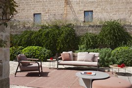 3-miestna pohovka Astra od spoločnosti Roda. Pohovka má rám z lakovaného hliníka, ktorý je pretkaný káblovým výpletom. Vankúše na sedenie sú vyrobené z kvalitnej vonkajšej tkaniny, takže pohovka môže byť vonku po celý rok bez toho, aby ste ju museli chrániť pred dažďom.