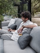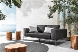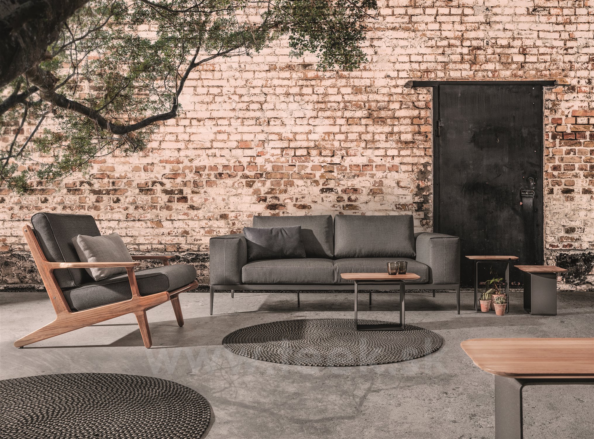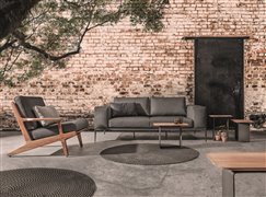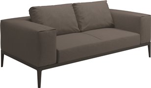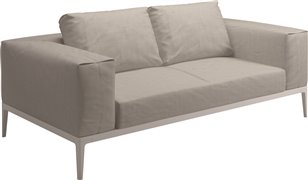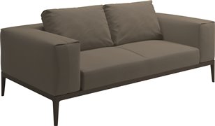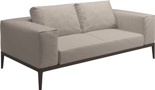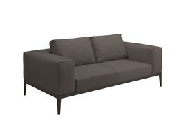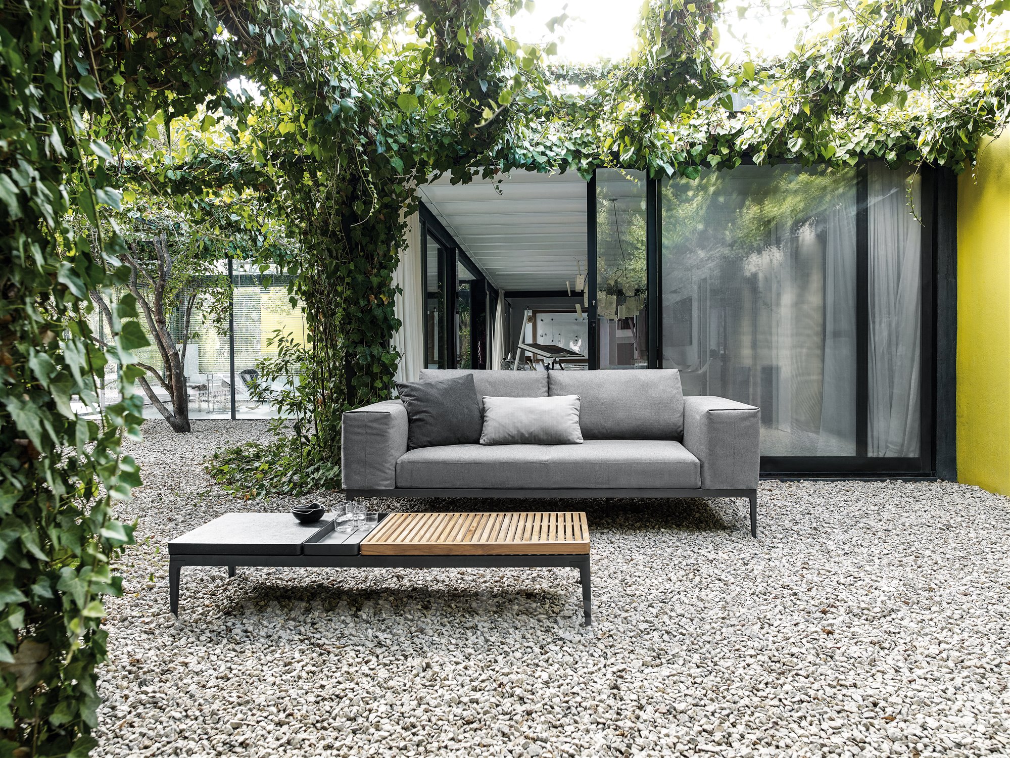 Garden sofa Grid by Gloster. Outdoor cushioned sofa made of high quality outdoor fabrics and quick drying fillings on an aluminium painted frame. The seat cushions are designed for permanent outdoor use. Choose from a wide range of fabric colours. Dimensions: 206x103x85 cm, seat height: 40 cm, armrest height: 66 cm