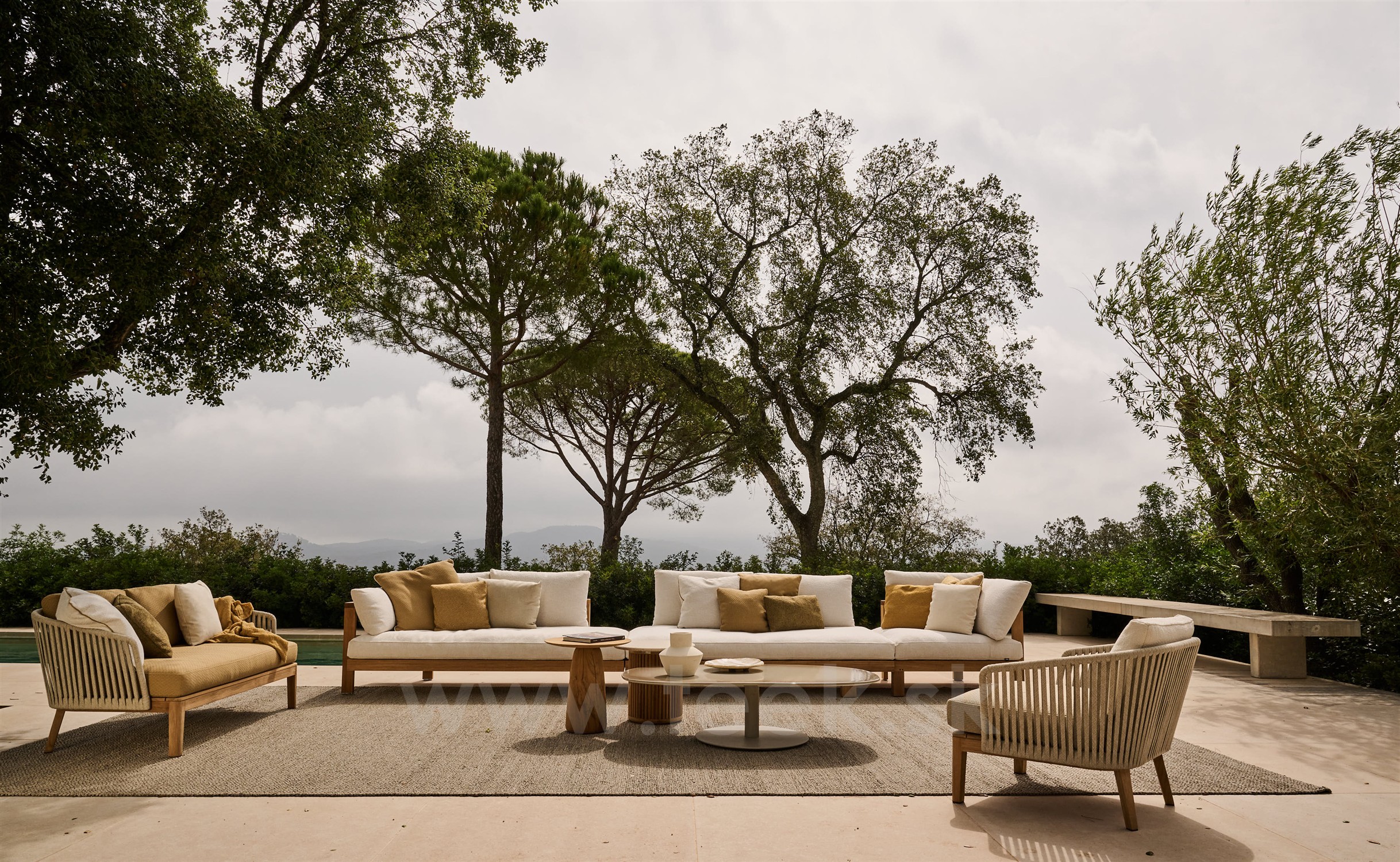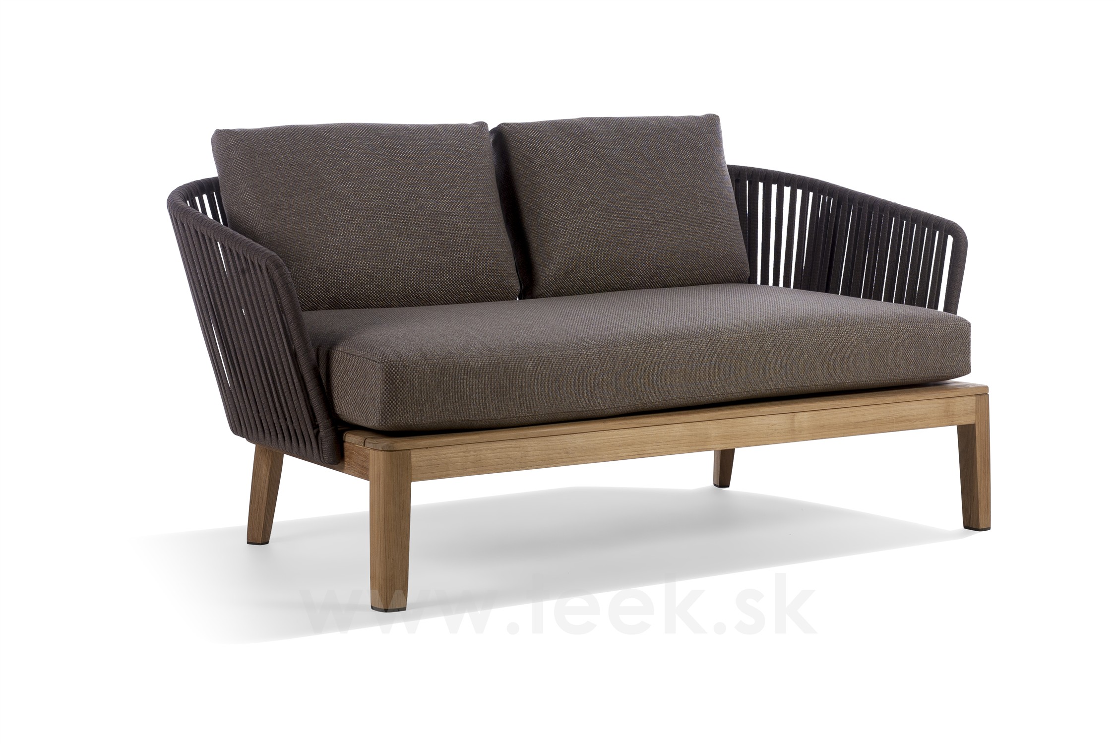 Vonkajšia 2-miestna pohovka/sofa Mood značky Tribu s rámom z teakového dreva a so širokým lankovým výpletom.