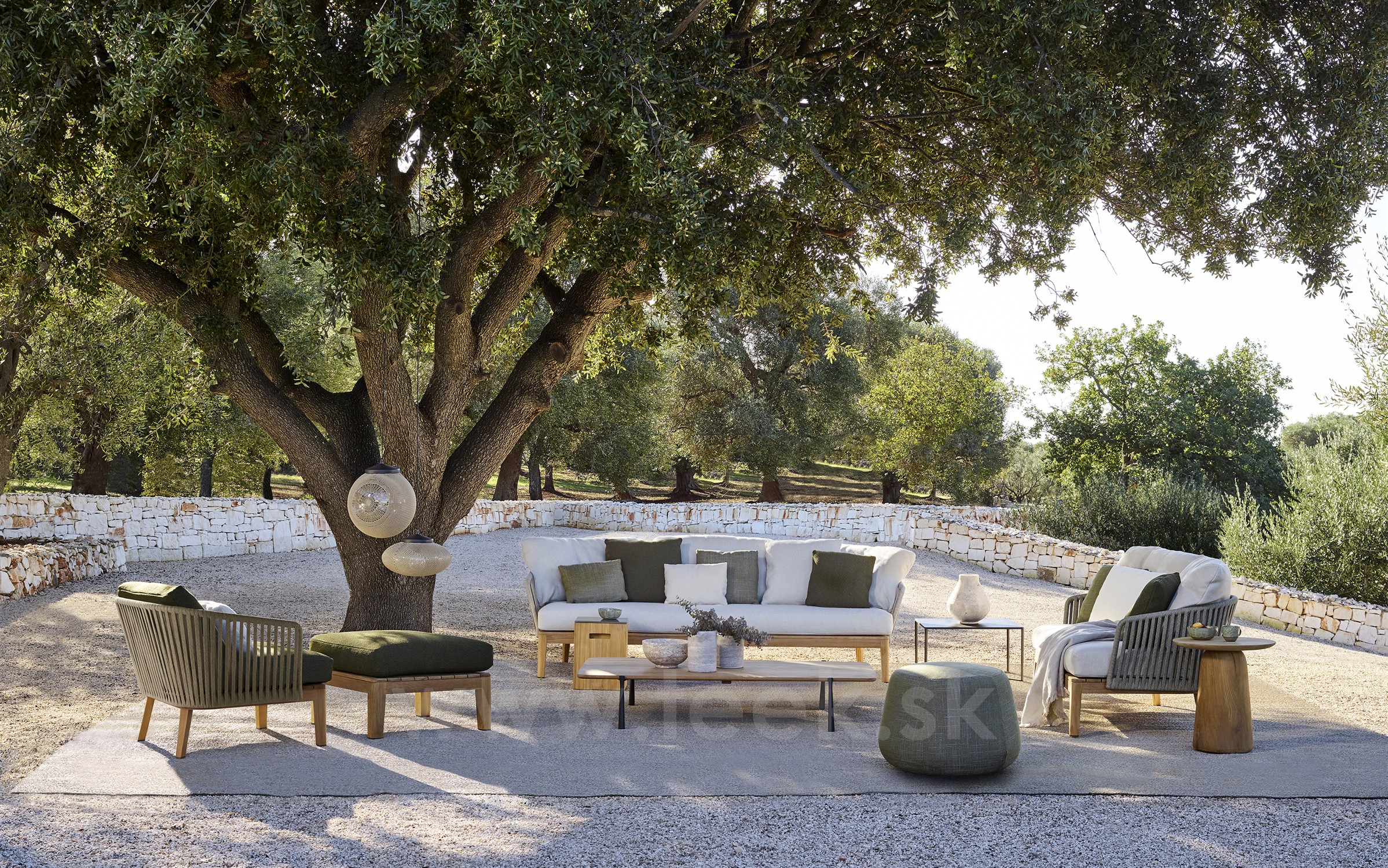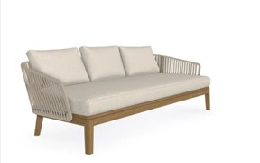 Vonkajšia 3-miestna pohovka/sofa Mood značky Tribu s rámom z teakového dreva a so širokým lankovým výpletom.