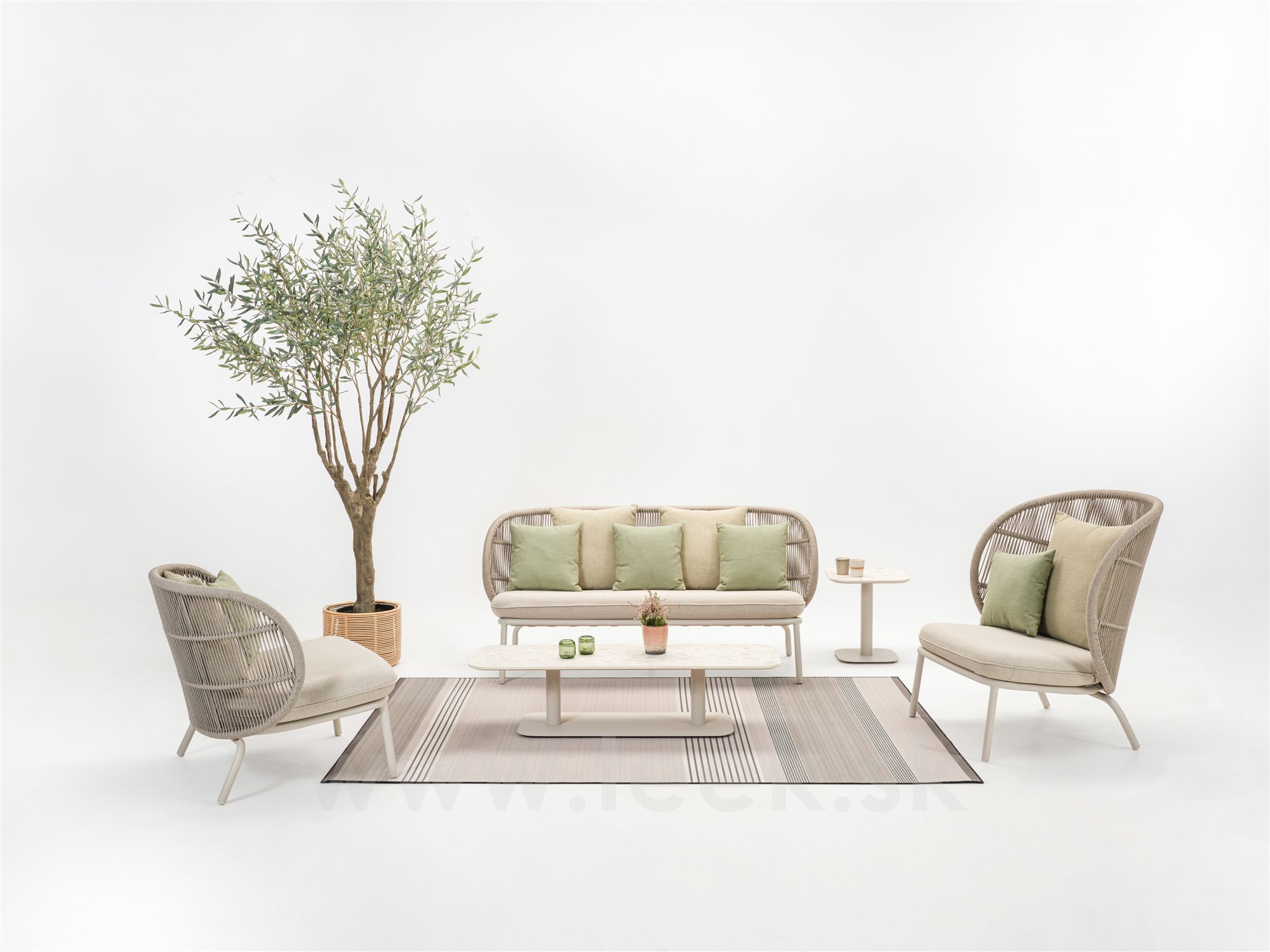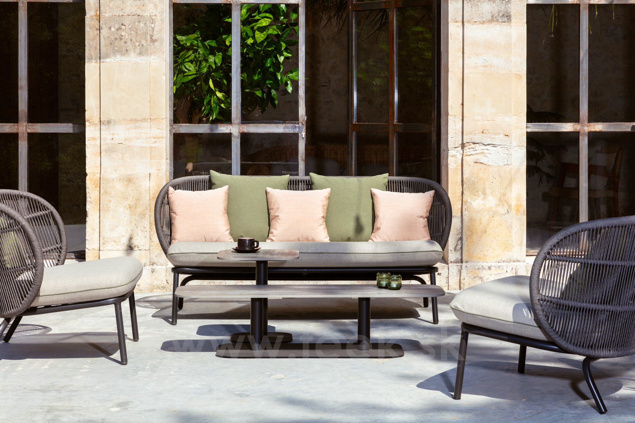 K venkovní pohovce je nutné doobjednat sedák a opěrné polštáře, které nejsou součástí. Sedák a opěrné polštáře jsou z venkovních odolných látek a z nepromokavé výplně.